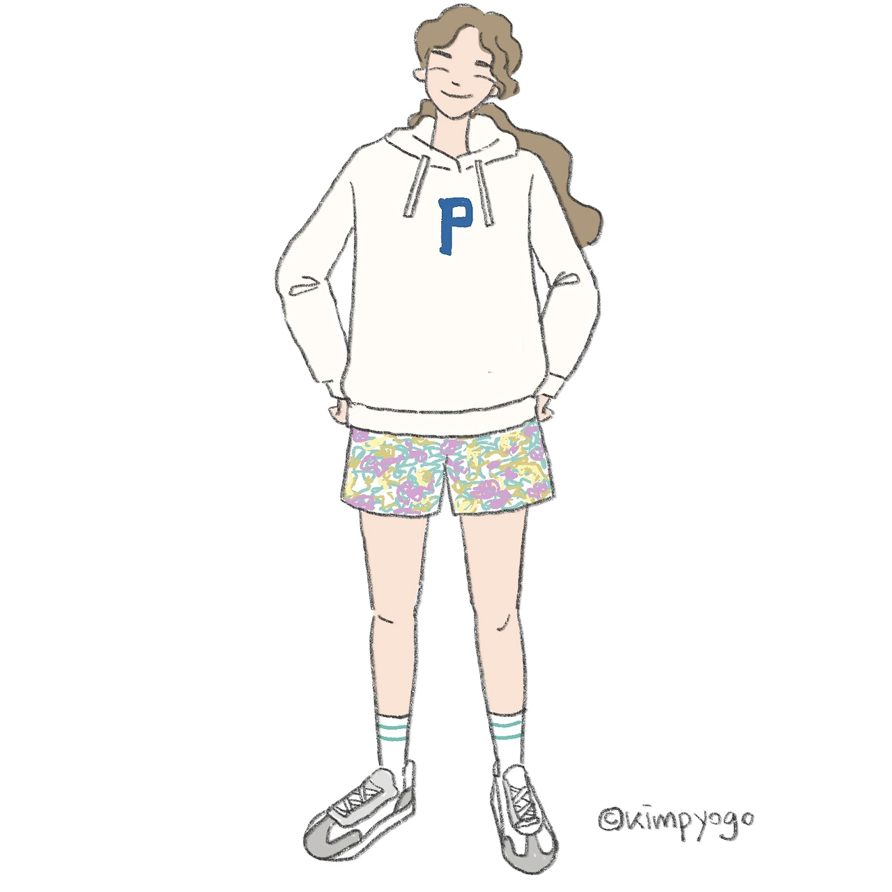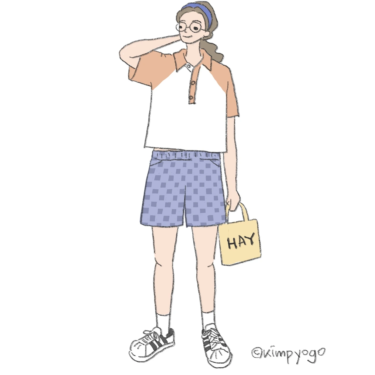 첫 번째 착장은 알록달록한 패턴이 들어간 쇼츠를 활용한 룩인데요, 이렇게 튀는 아이템을 스타일링하는 가장 쉬운 방법은 나머지 아이템을 뉴트럴 한 톤으로 맞추는 것이지요. 심플한 후드티에 심플한 컬러의 쇼츠를 입으면 그냥 무난한 룩이지만, 예쁜 패턴의 쇼츠로 바꾸기만 해도 나들이룩으로, 페스티벌 룩으로도 손색이 없는 센스 있는 착장이 된답니다. 여름을 맞아 컬러로 포인트를 주고 싶으셨던 분들이라면 이 룩, 추천드릴게요!