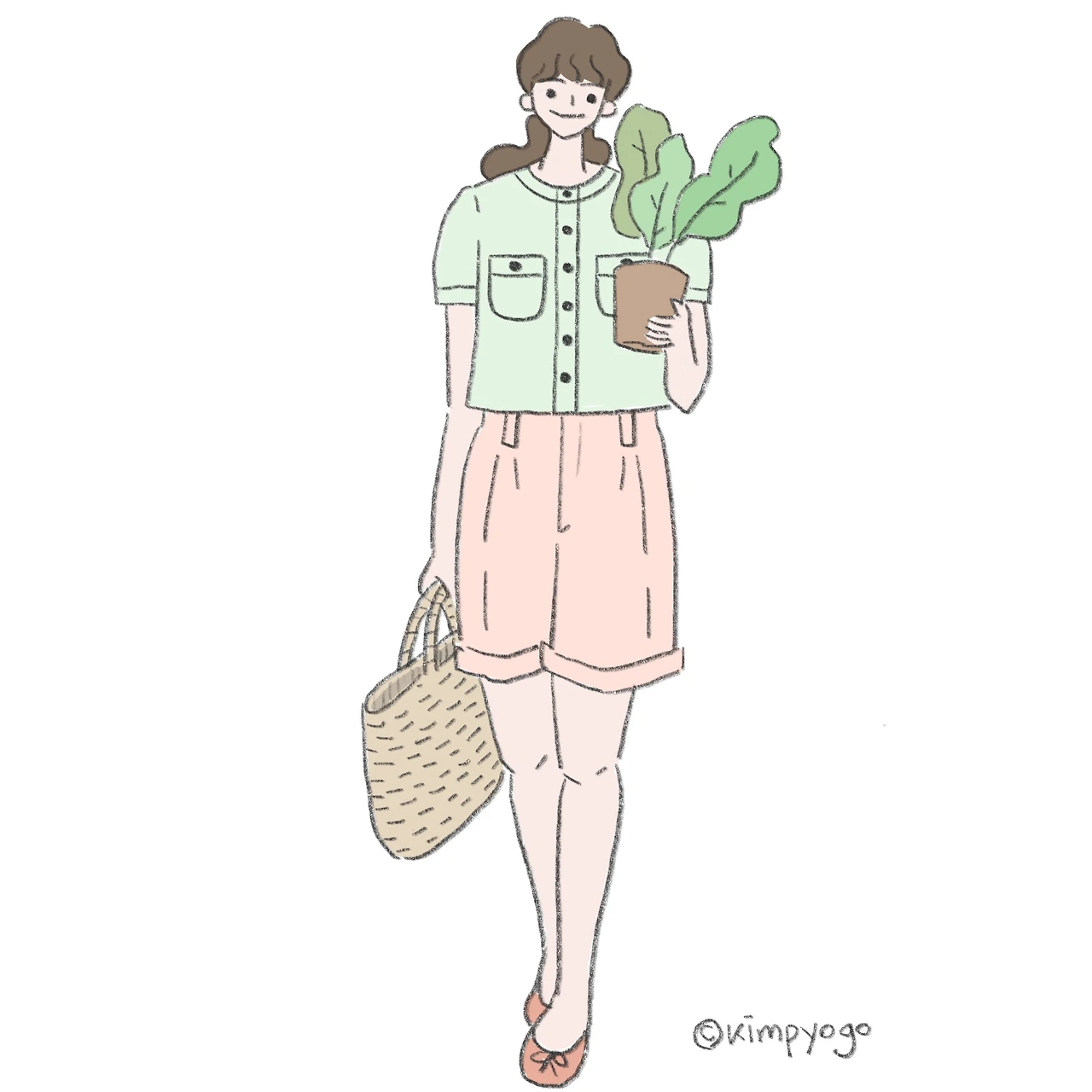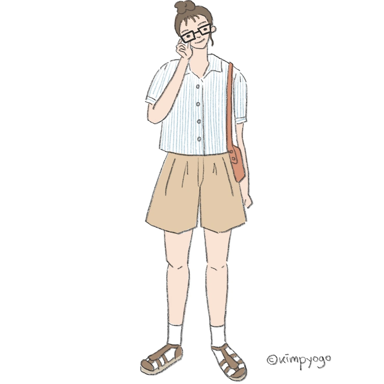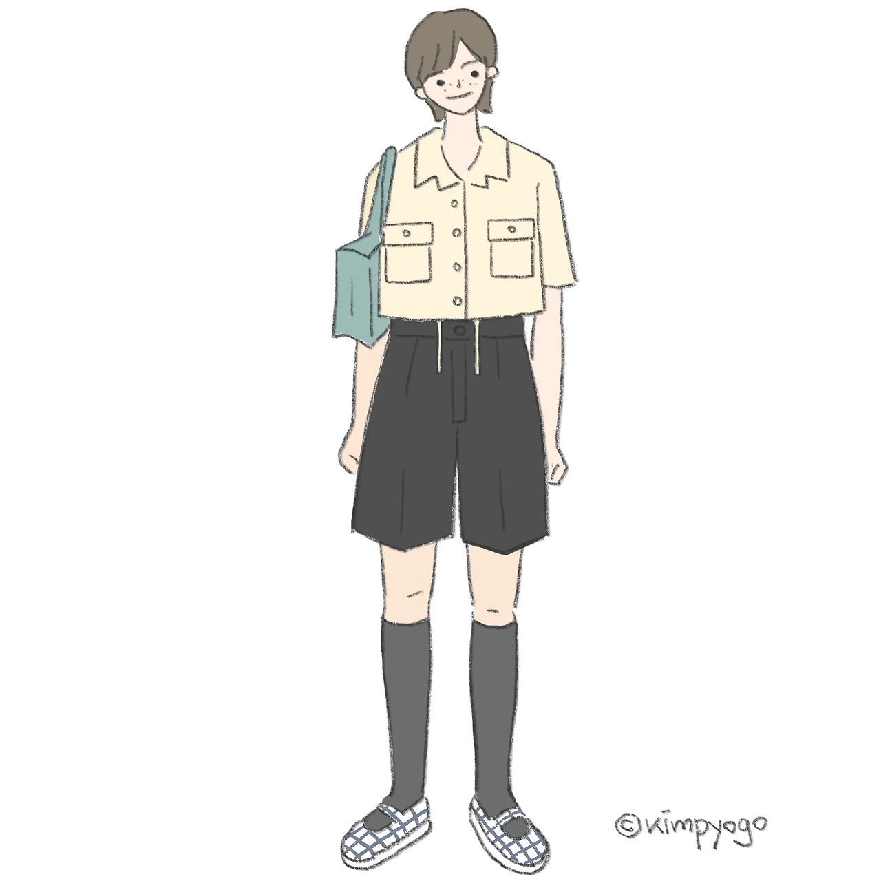 두 번째 룩은 프레피룩 느낌이 더해진 캐주얼한 착장입니다. 올여름 버뮤다팬츠가 사랑받고 있는데요, 그림처럼 하이웨이스트 버뮤다팬츠에 크롭 셔츠를 입으면 귀여우면서도 보이시한 매력의 룩이 됩니다. 신발은 보이시함을 더 강조하고 싶다면 로퍼를, 귀여움을 더 강조하고 싶다면 패턴이 들어간 메리제인 슈즈를 추천드릴게요.
