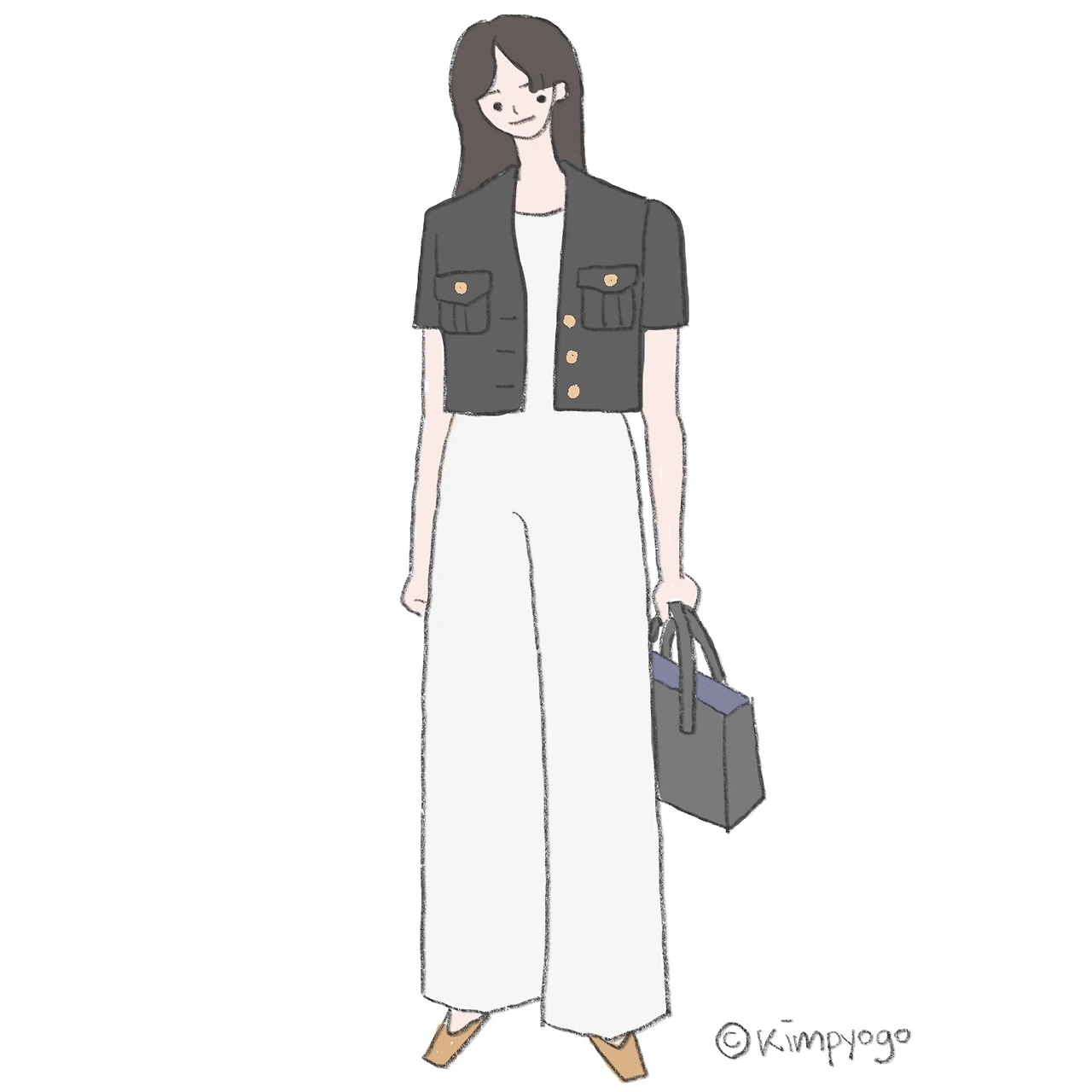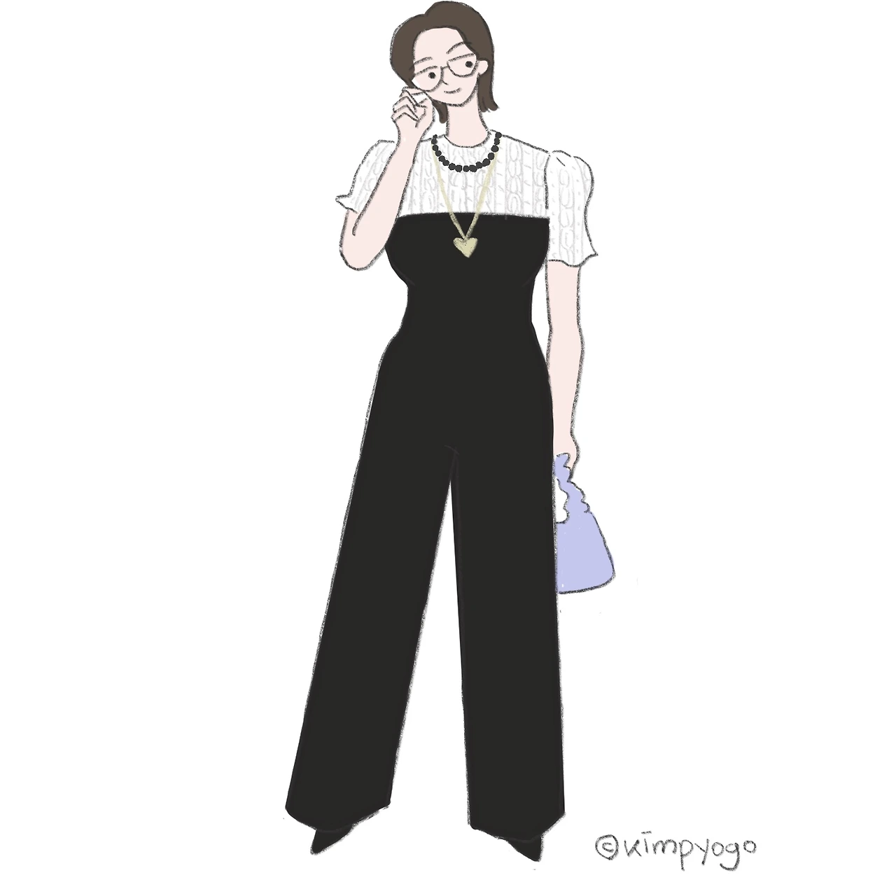 마지막은 재킷을 더해 출근룩으로도 적당한 포멀한 룩으로 연출해 보았습니다. 그림과 같이 기장이 발등을 덮을 정도로 긴 점프수트는 전체적으로 길어 보이는 시각적 효과가 있는데요. 거기에 크롭 기장의 재킷을 더하면 재킷이 끝나는 선부터 아래까지 전부 다리처럼 보여서 매우 늘씬해 보이는 룩이 됩니다. 앞코가 뾰족하거나 긴 디자인의 구두까지 더한다면 효과는 더해지겠죠? 뻔하지 않은, 멋스러운 출근룩을 원하시는 분께 추천드릴게요!