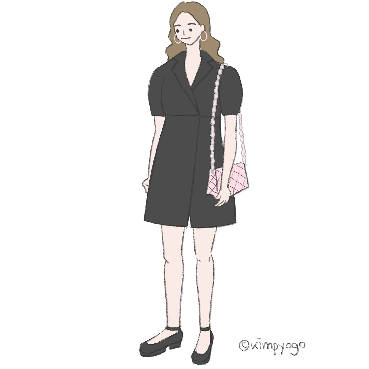 이번에는 미니 기장의 점프수트입니다. 가슴선이 높게 디자인된 점프수트(혹은 원피스)는 키가 작고 마른 분들이 입으시면 키도 커 보이고 귀여운 느낌도 살릴 수 있는 아이템인데요, 전체적으로 검은색으로 톤을 맞추고 핑크색 같이 파스텔 톤 컬러의 가방으로 포인트를 주면 세련되면서도 귀여운 룩으로 완성! 결혼식 하객룩으로도 손색이 없는 룩입니다.