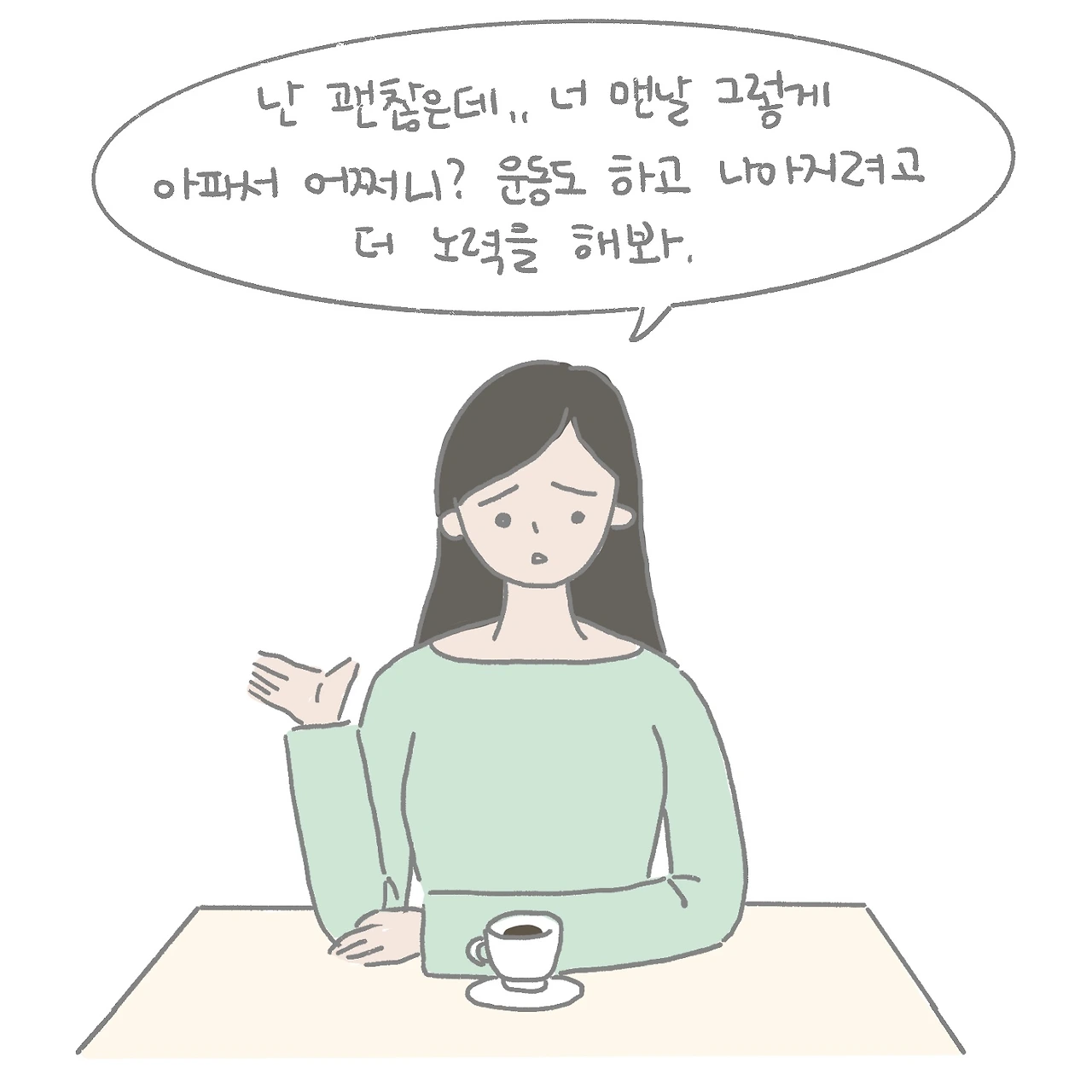 아픈 날이 너무나도 오래 지속이 되자 어느 순간 괜찮은 척을 하는 것이 어려워지고, 그러다 보면 점점 누군가를 만나는 것도 두려워졌습니다. 매일 아픈 내가 나도 이렇게 지겨운데 타인은 내가 얼마나 지겹고 혐오스러울까 싶은 마음이 들었기 때문입니다.