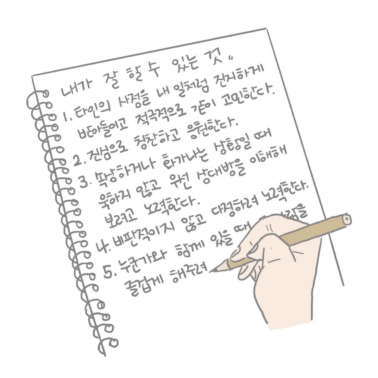 우선 저는 저의 가치를 알고 싶었습니다. 적게라도 사랑하는 사람에게, 사회에 기여하는 바가 있는 사람이고 싶었습니다. 그래서 제가 잘할 수 있는 것이 무엇인지 적어보았습니다.