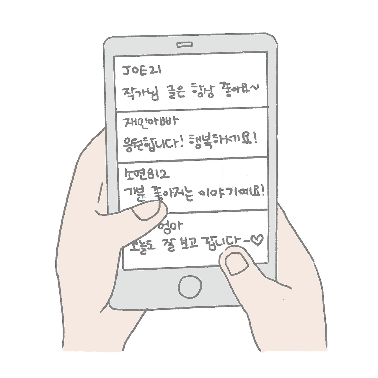 적다 보니 저는 사람들을 위로하고 기쁘게 하는 것을 좋아한다는 것을 발견했습니다. 그래서 저는 매일 조금씩 제가 잘할 수 있는 것들을 적극적으로, 더 많이 하려고 노력했습니다. 만화를 그리기 시작한 것도, 또 꾸준히 그리고 있는 것도 제 이야기로 누군가를 위로하고 응원할 수 있다면 좋겠다고 생각하기 때문입니다. 그래서 제 글에 위로를 받았다고, 용기를 얻었다고 댓글을 올려주실 때면 한없이 감사하고 행복합니다.