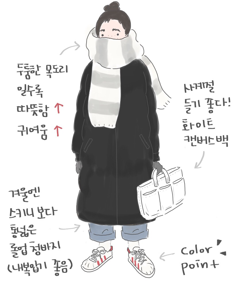 이 스타일은 제가 정말 정말 좋아해서 가장 추천하고 싶습니다. 패딩이 보통 오버사이즈이니 나머지는 최대한 날씬해 보이도록 표현하는 경우가 많은데요, 반대로 아예 전체적으로 넉넉한 사이즈로 통일해서 편안하면서도 귀여운 느낌을 주는 방법입니다. 그림에 나온 것 같이 둘둘 감아주기 좋은 커다란 목도리는 자라(Zara)에서 29,000원에 구입한 건데요, 울 소재는 아니지만 저렴해 보이지 않고 무엇보다 귀엽고 따뜻해서 자주 애용합니다. 그리고 넉넉한 사이즈의 바지(주로 안에 기모가 들어간 면바지)를 롤업 해서 입는 건 이 스타일의 귀여움을 담당하는 또 다른 포인트! 스키니 안에 검정 스타킹을 많이 입는 분들을 많이 봤는데 혈액순환에 너무 안 좋답니다. ㅠㅗㅠ 대신 이렇게 통 넓은 바지를 입으면 아래 내복도 입을 수 있고, 발목이 드러나게 접어주고 앙고라 양말을 신어주면 포근하면서 귀엽습니다. (사이즈가 적당하게 큰 걸 선택하면 의외로 덩치가 커 보이지 않아요. 이런 스타일의 팬츠를 구입하는 법에 대해서는 다음 기회에 정보 공유할게요.)