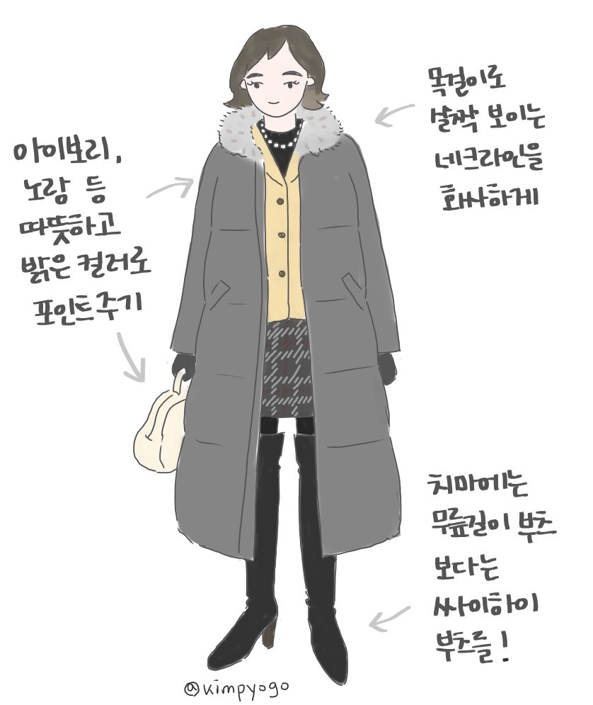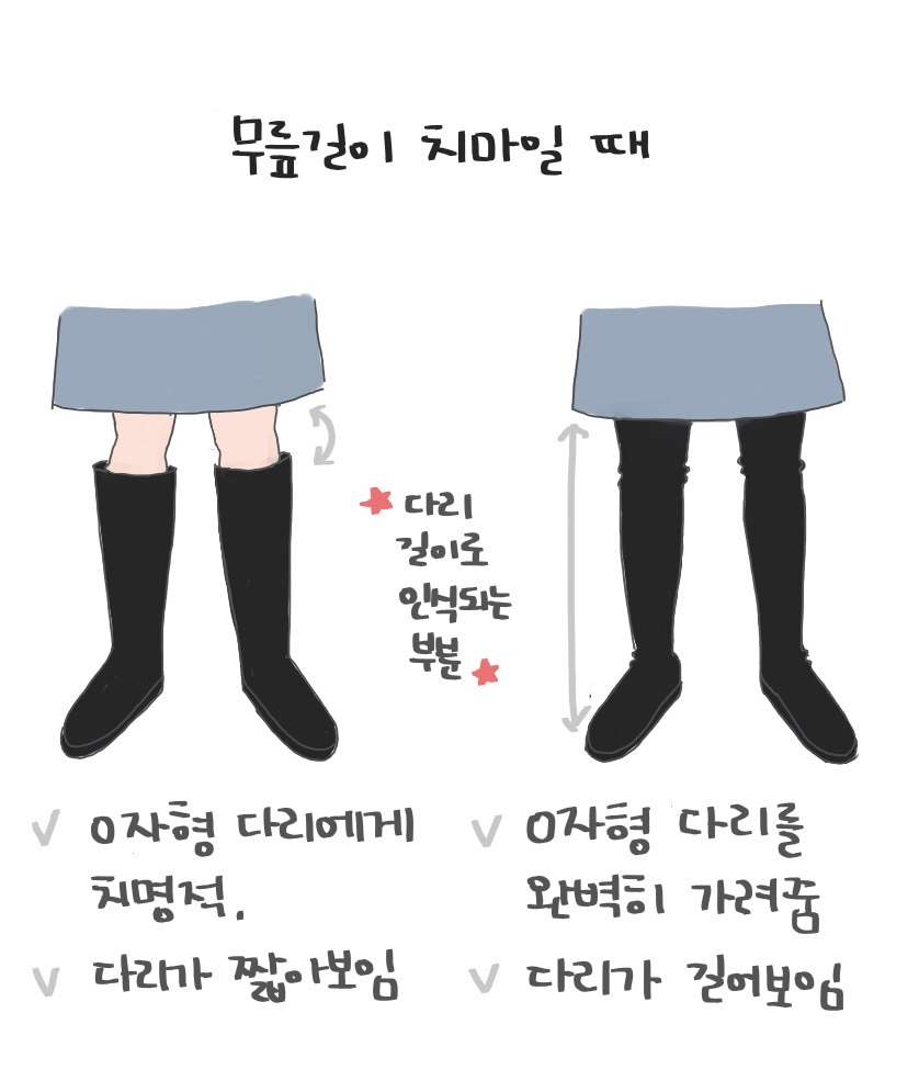 보시면서 왜 치마에는 무릎길이 부츠보다 사이하이 부츠(무릎 위, 허벅지를 약간 가리는 길이의 부츠)를 신는 것을 추천했는지 궁금하실 것 같은데요. 아래 그림으로 좀 더 자세히 설명드릴게요.