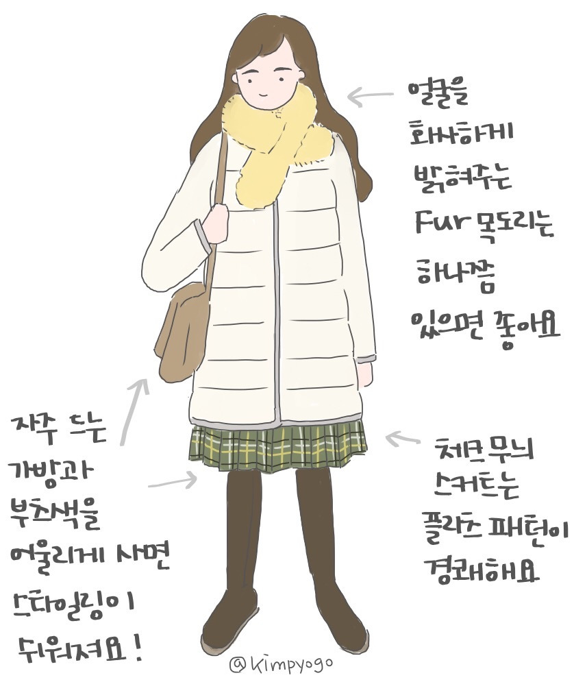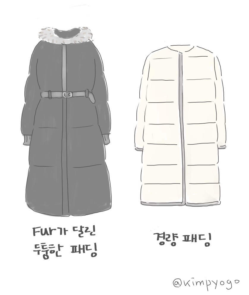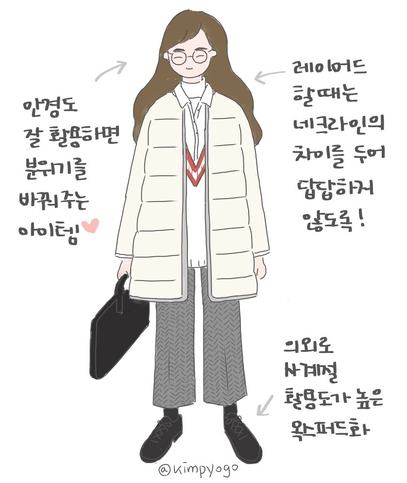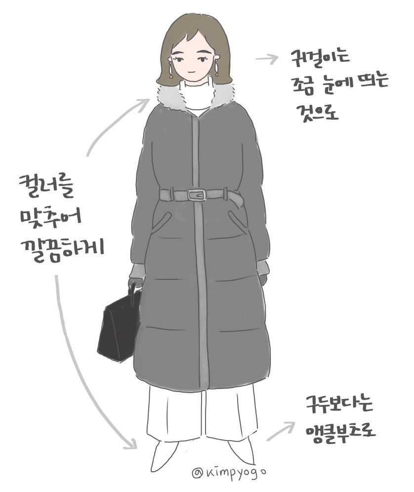 같은 패딩으로 이번에는 중성적인 이미지의 룩을 그려보았습니다.