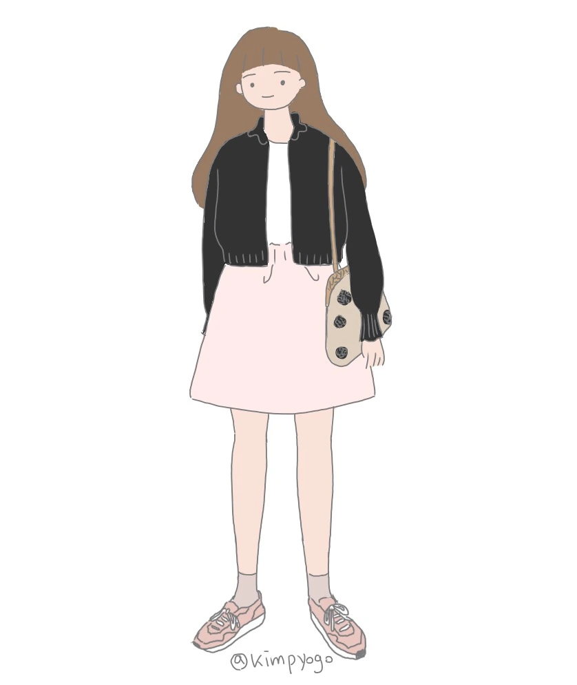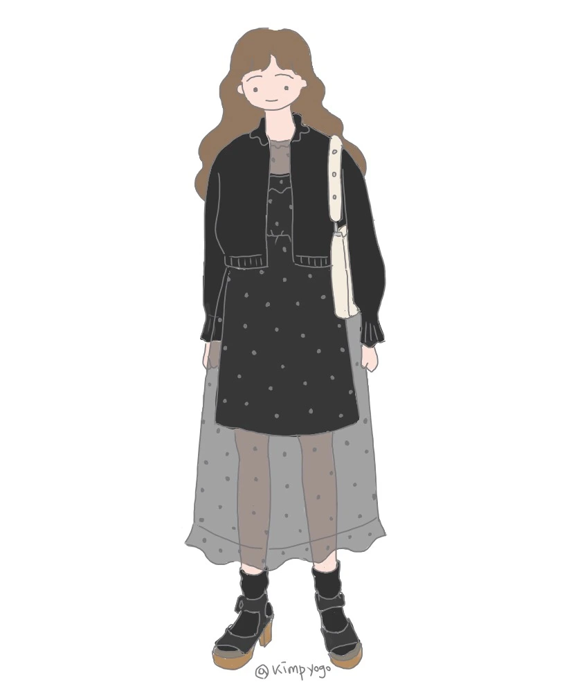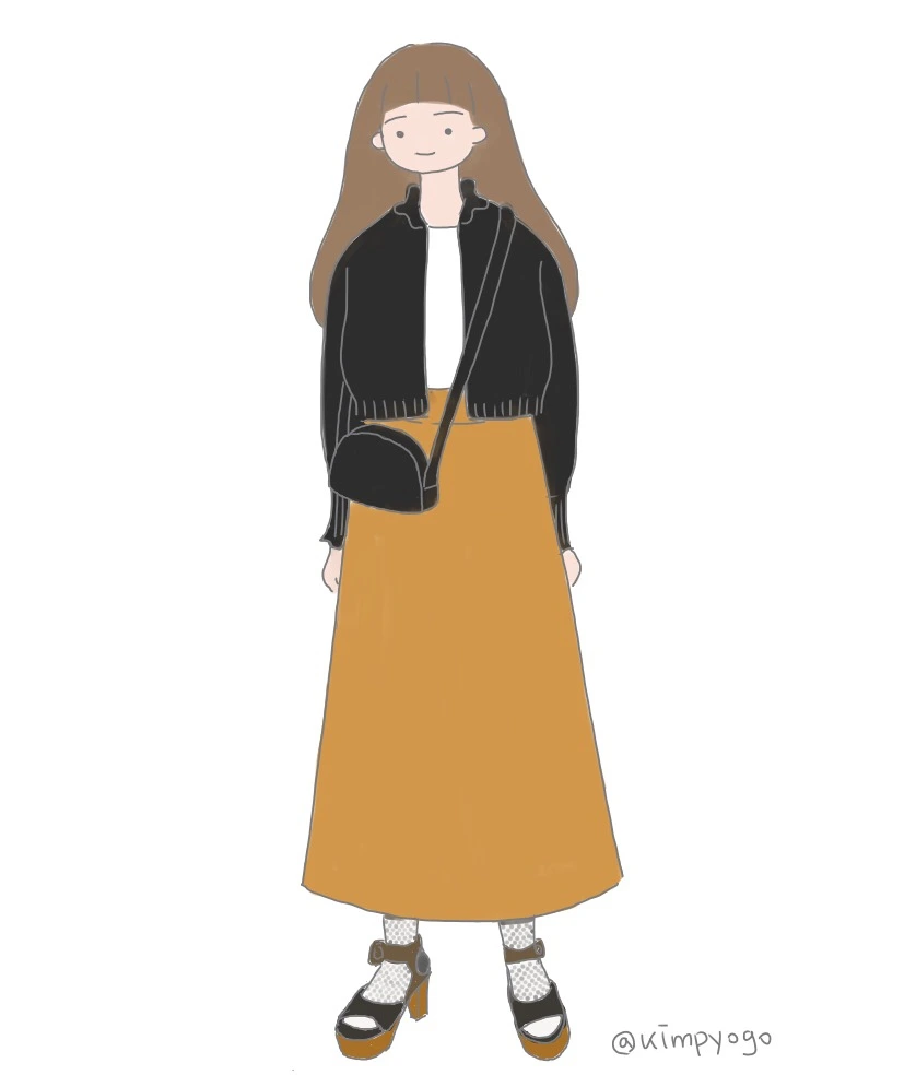 제가 가지고 있는 것은 네크라인과 손목에 살짝 러플 디테일이 들어가서 검은색임에도 사랑스러운 스타일의 점퍼인데요. 그래서 스커트나 원피스와 조합이 좋습니다. 그림과 같이 하이웨이스트 롱스커트는 정말 다리가 길-어 보이는 아이템인데요. 여기다 높은 굽의 구두나 샌들을 신으면 정말 늘씬해 보이는 효과가 있습니다. 이렇게 허리가 높은 스타일의 하의를 입을 때는 외투도 허리선을 넘지 않는 짧은 것을 선택해야 길어 보이는 효과가 유지되고, 살짝 귀여운 느낌도 더할 수 있습니다. 저는 여기에 크로스백을 매치해서 캐주얼한 느낌으로 마무리 했는데요요, 가방만 바꾸어도 더 사랑스럽게 혹은 시크하게 변화를 줄 수 있습니다.