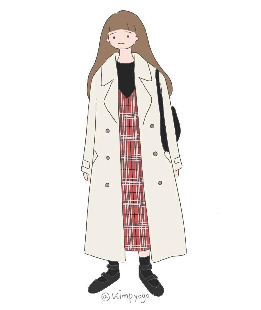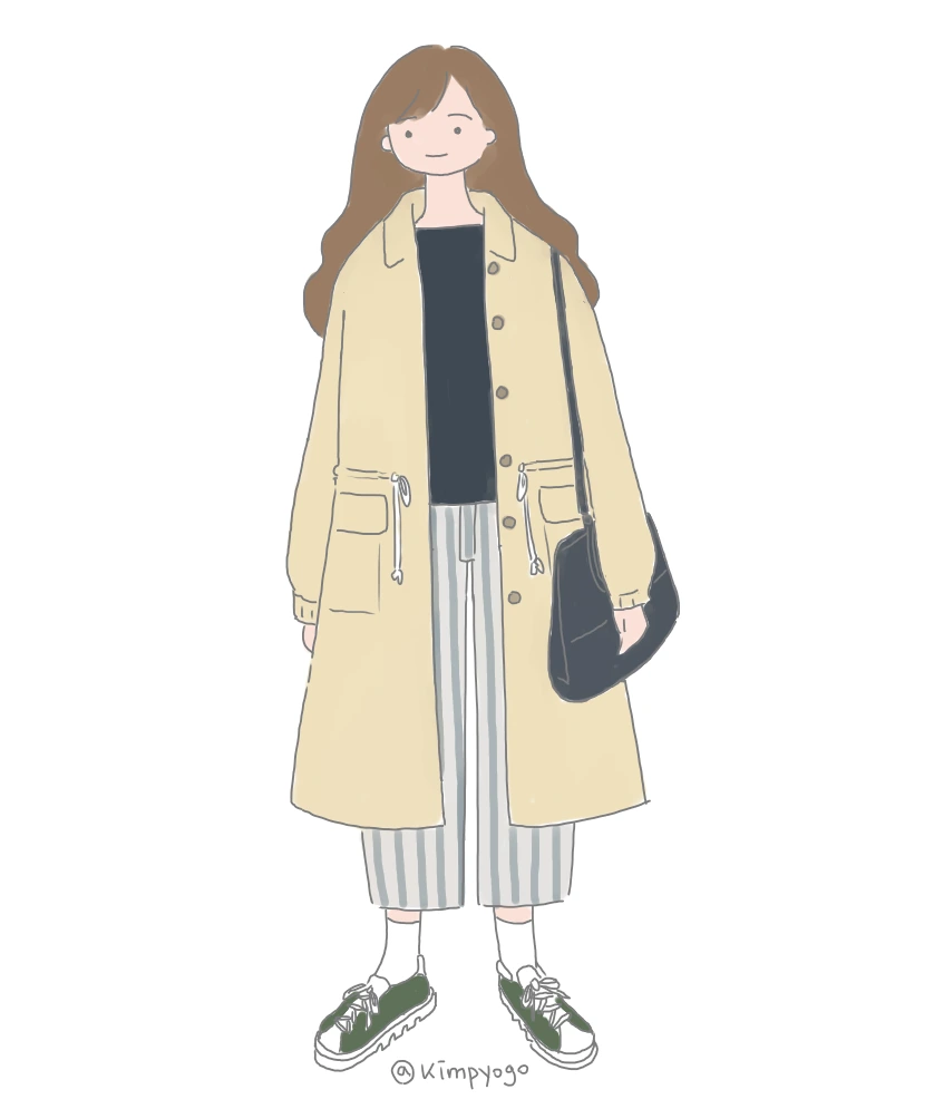 이번 스타일은 트렌치코트로 귀여운 느낌을 내는 방법입니다. 트렌치코트 중에서 위와 같이 A라인으로 떨어지거나 소매가 살짝 볼륨감이 있는 등 귀여운 터치가 더해진 디자인이 있죠. 이런 스타일은 원피스나 스커트와 주로 함께 입으실 텐데요, 살짝 배기하고 조금 짧은 기장의 바지와 매치하셔도 잘 어울립니다. 가방과 신발도 심플하지만 귀여운 느낌이 있는 것으로 선택하면 전체적으로 귀엽지만 과하지 않은 느낌의 룩을 완성할 수 있습니다.