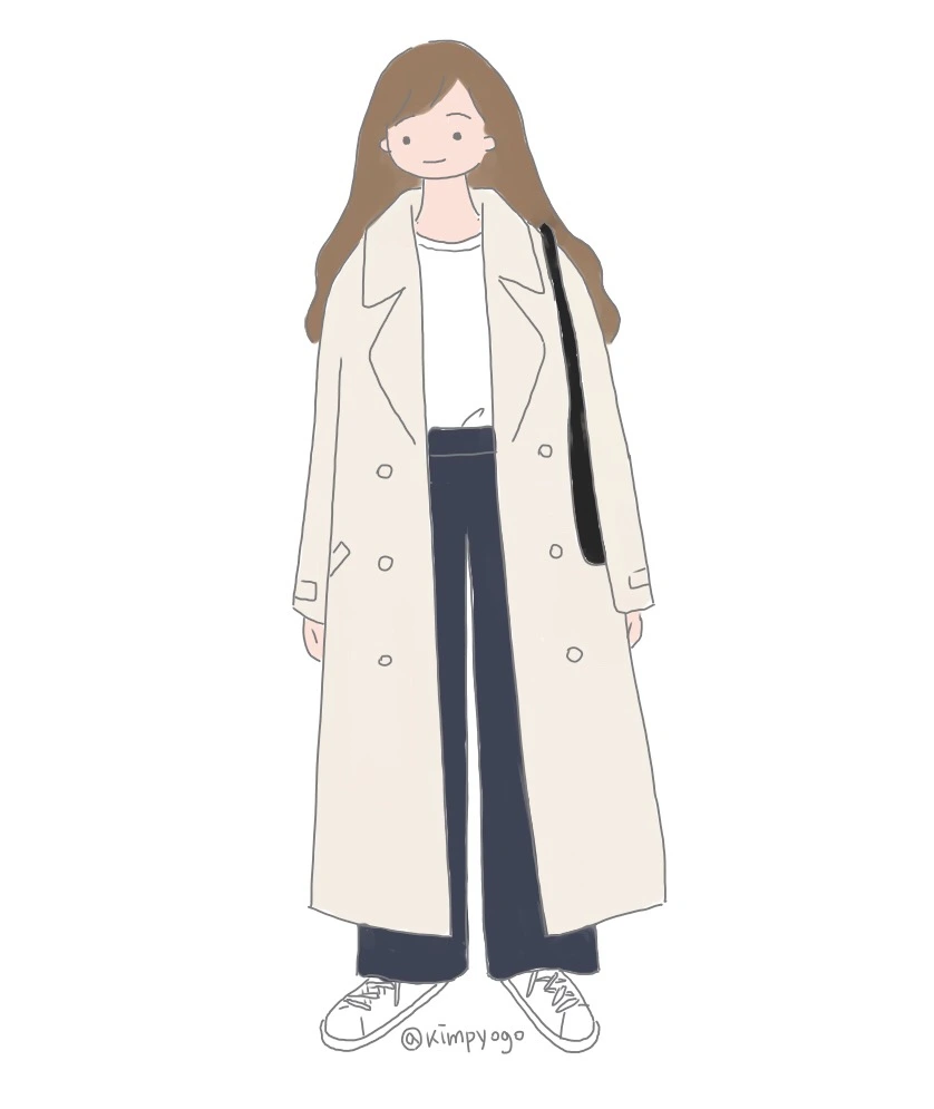 같은 트렌치코트의 다른 스타일링입니다. 하이웨이스트 팬츠와 함께 입어보았는데요. 이때 바지는 너무 와이드 한 핏으로 고르시는 것보다 골반 아래로 일자로 떨어지는 스트레이트 핏으로 입으시는 것을 추천드립니다. 바지까지 너무 오버사이즈가 되면 아버지 옷 빌려 입은 것 같이 될 수도 있거든요. 그림과 같이 티셔츠와 신발은 흰색으로 통일해서 깔끔하게 마무리하는 것이 가장 무난하고요, 레이스 탑에 플랫슈즈를 매치하면 또 다른 느낌의 룩으로 완성하실 수 있습니다.
