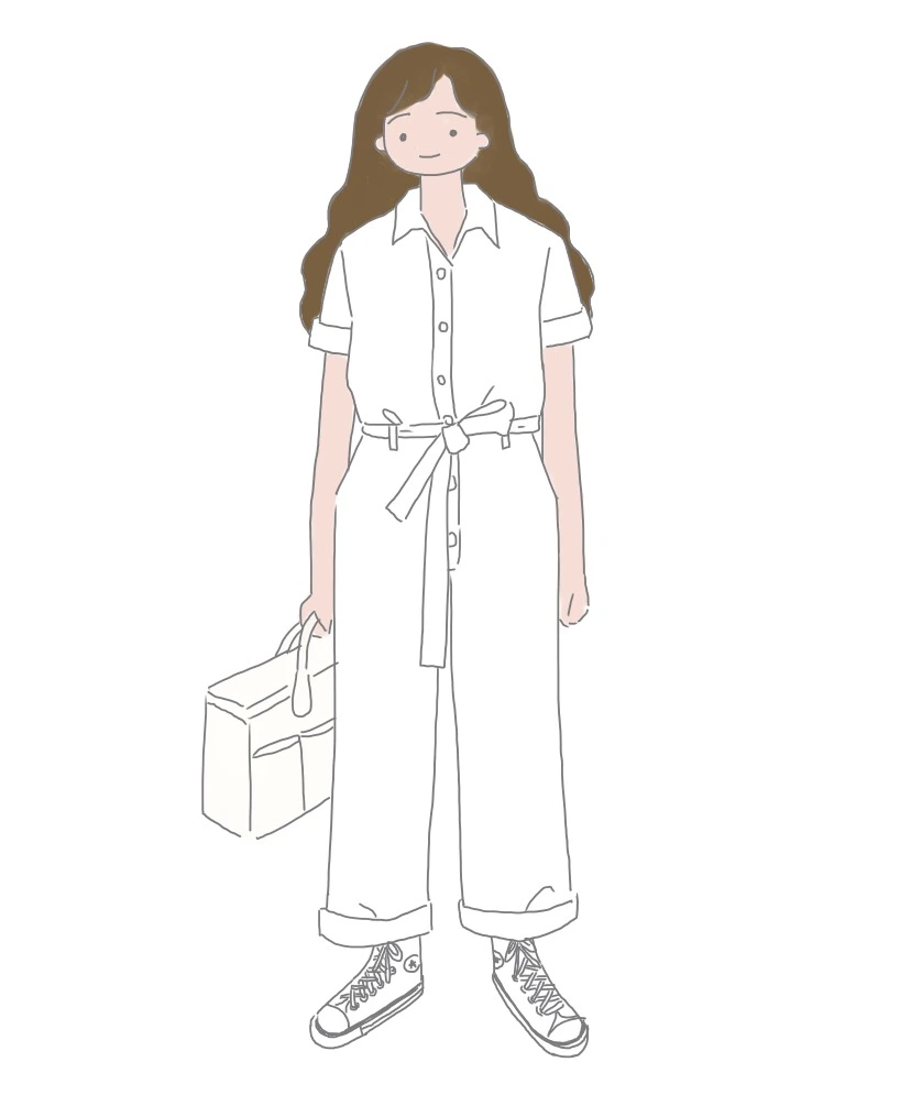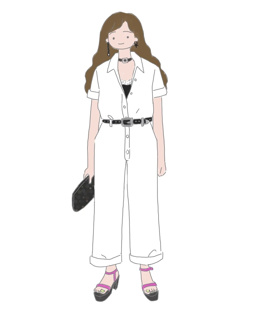 이 룩은 점프수트를 포함하여 올 화이트로 연출하여 깔끔한 느낌을 살린 스타일입니다. 가방과 신발의 디자인 덕분에 보이시한 느낌이 납니다.