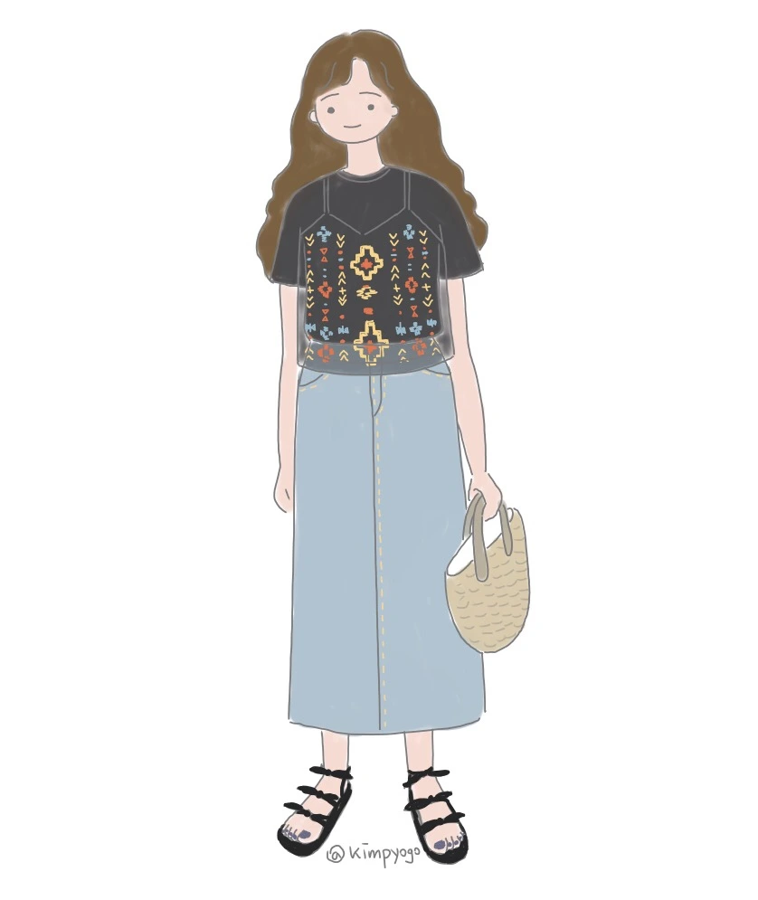 마지막은 캐쥬얼한 느낌의 롱스커트 스타일링입니다. 앞의 스타일이 사랑스러운 스타일이라면 이번은 편안해 보이지만 귀여운 포인트가 있는 룩입니다. 이 룩의 포인트는 상의의 메쉬(망사) 소재 베스트(조끼)와 리본 장식이 들어간 샌들입니다. 베스트는 활용도가 광장히 높은 아이템이라 자주 애용하는데요, 슬리브리스 탑(나시티셔츠)과 연출하면 시원해 보이고, 반팔과 매치하면 귀여운 느낌을 낼 수 있고, 가을에는 긴팔 티셔츠에 입고 가디건이나 자켓을 걸쳐서 활용할 수도 있기 때문이지요. 이런 베스트를 고를 때는 레이어드를 할 수 있도록 너무 딱 달라붙지 않는 것을, 길이는 조금 짧은 것으로 하는 게 좋은데, 안에 입는 옷을 하의 안에 집어넣고 허리선에 딱 맞게 입으면 다리가 길어 보이는 효과가 있기 때문입니다. 이런 베스트와 가장 궁합이 좋은 걸 고르라면 저는 청스커트를 추천하고 싶습니다. 베스트 특유의 경쾌함과 어울리면서 매치했을 때 실패가 적은 조합이기 때문이죠. 그나저나 입으면 입을수록 데님 소재는 참으로 매력적인 소재인 것 같습니다. 당최 질리질 않네요. ㅎㅎ