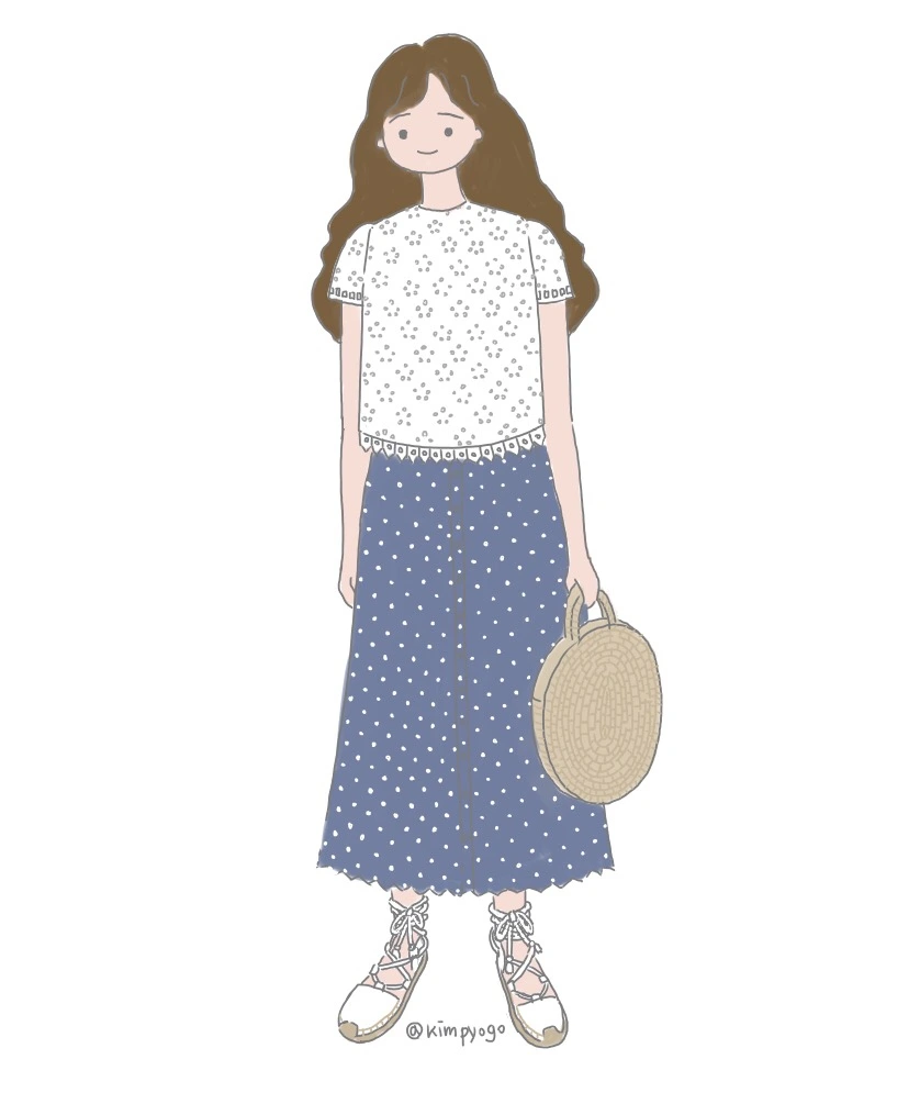 아래로 퍼지는 A라인으로 되어있는 스커트는 한 벌쯤 가지고 계시죠. 저는 주름이 잡혀있고 전체적으로 도트무늬가 들어간 50년대 느낌의 살짝 복고적인 스커트를 가지고 있는데요, 참고로 이런 스타일은 &otherstories에서 자주 나옵니다. 이 스커트는 상의를 티셔츠를 입어도 화이트 셔츠를 입어도 무난하게 어울리며 사랑스러운 느낌으로 연출할 수 있어 하나쯤 갖고 있으면 좋은 아이템이지요. 저는 아일렛 원단(구멍이 전체적으로 자잘하게 뚫려있는 원단으로 구멍으로 패턴을 만든 레이스 원단을 말합니다.)의 레이스 탑을 입고 상의와 색을 맞춘 발목을 묶어서 신는 에스빠듀 샌들을 매치한 다음, 스트로(straw) 소재의 가방으로 마무리했습니다. 상의와 신발은 색으로 통일감을 주고, 신발과 가방은 여름 소재로 소재를 통일하여 전체적으로 어우러지게 한 룩입니다.