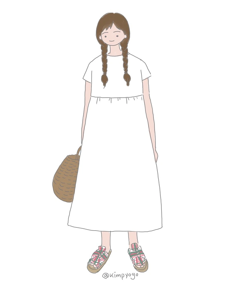 두 겹의 얇은 거즈 같은 면으로 되어있는 긴 기장의 원피스는 뜨거운 태양도 가려주고 땀 흡수도 빨라서 여름에 입기 참 좋지요. 또한 땀이 금세 잘 마르기도 해서 실내에 들어가면 곧 쾌적해지기도 해서 기능성이 뛰어난 소재입니다. 원피스가 흰색이면 자칫 잠옷처럼 보일 수 있는데요, 그래서 악세서리를 신경 쓰는 것이 좋습니다. 위처럼 패턴이 들어간 신발을 신거나 목걸이나 팔찌를 조금 눈에 띄는 것을 매치하면 기본 바탕이 심플하기 때문에 원하는 분위기로 얼마든지 다양하게 연출할 수 있습니다.
