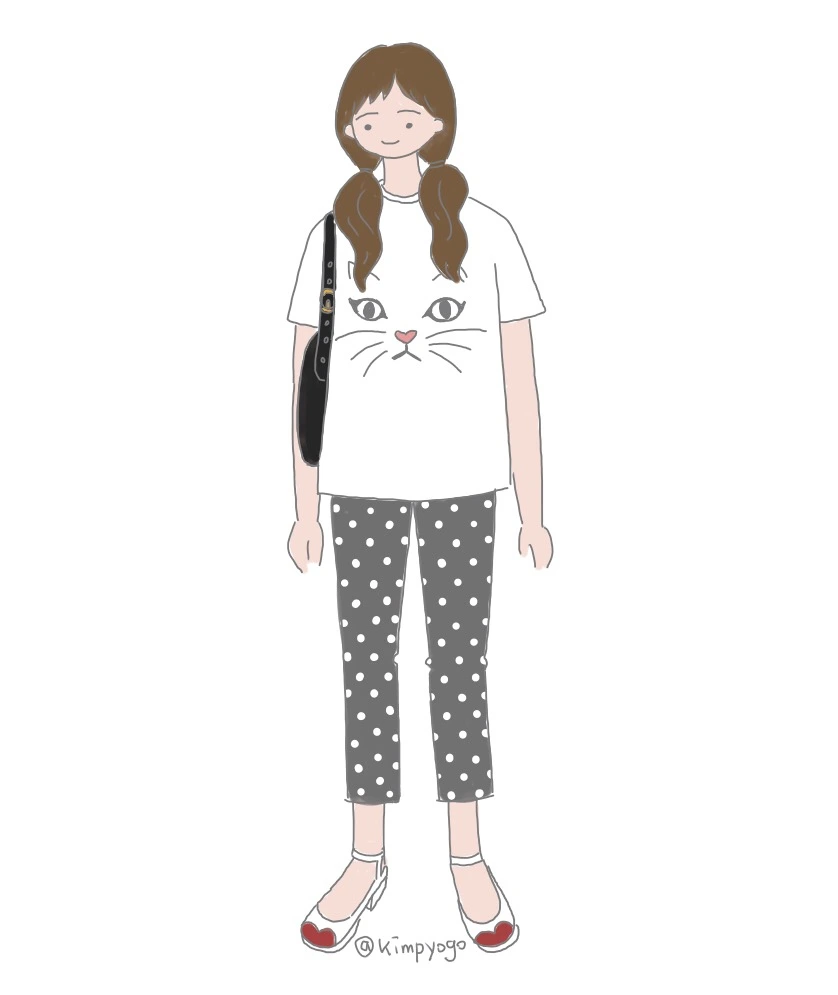 저는 고양이를 키우는지라 고양이 아이템만 보면 그냥 지나치기 힘든데요. 하하 고양이 아이템은 보통 굉장히 귀여운 디자인이 많은데 이 티셔츠에 있는 고양이 프린트는 새초롬해서 더 매력적이라 고민 없이 선택했었답니다. 이렇게 눈에 띄는 디자인의 티셔츠를 입었을 때는 하의는 어떻게 매치해야 하나 고민되시죠? 저는 깔끔하지만 밋밋하지 않은 아이템을 고르는 것이 가장 좋다고 생각한답니다. 위의 그림처럼 경쾌한 느낌의 도트무늬 8부 길이 바지에 귀여운 포인트가 있는 신발을 신으면 티셔츠의 상큼하고 귀여운 느낌과도 연결되지만, 색상을 많이 사용하지 않았기 때문에 깔끔한 분위기를 줄 수 있습니다.