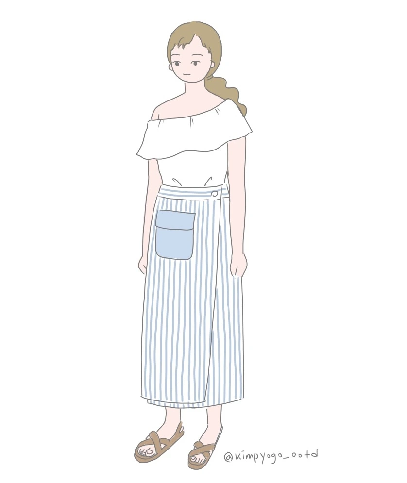 마지막 착장은 과감한 상의를 입어 시선을 상의로 분산하는 방법입니다. 하체 부종이 심하신 분들 중에 상체는 날씬하신 분들이 많은 것 같아요. 그런 분들이라면 상체를 조금 과감하게 드러내어 예쁜 부분을 강조하고 하체는 깔끔하게 입는 것은 어떨까요? 특히 캐주얼 스커트 중에서도 다리가 예뻐 보이는 스커트가 랩스커트인데요. 치마의 특성상 걸을 때마다 다리의 일부만 살짝살짝 드러나서 섹시하면서도 멋스러운 느낌이 납니다. 이러한 랩 스커트를 고르실 때 한 가지 팁을 하나 드릴게요. 랩스커트는 바람이 불면 훌렁 들려서 속옷이 보일 수도 있기 때문에 약간 두께감이 있거나 덮는 부분이 그림처럼 포켓이 있어서 눌러주는 디자인으로 선택하시는 것이 좋습니다. 위 그림은 더블유컨셉에 있는 FACADE PATTERN의 랩 벨티드 스커트의 디자인을 참조했으니 관심 있으신 분들은 찾아보셔도 좋을 거 같아요.
