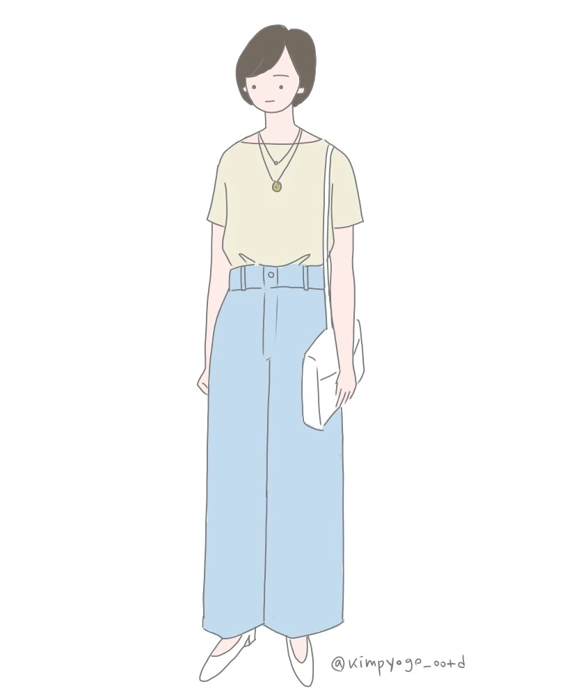첫 번째 착장은 와이드 팬츠를 이용하는 방법입니다. 와이드 팬츠를 고르실 때는 허리는 잘 맞고(하이웨이스트라면 다리도 더 길어 보이죠.) 골반 부분에서 아래로 일자로 떨어지는 것을 고르시는 게 좋습니다. 그리고 엉덩이 부분(특히 엉밑살 부분)이 끼지 않는 조금 여유 있는 핏으로 고르시는 걸 추천드리고요, 원래 입던 사이즈보다 한 사이즈 큰 걸 사시고 허리 부분만 수선해서 입으시는 것도 좋습니다. 와이드 팬츠가 볼륨감이 있기 때문에 상의는 몸에 잘 맞는 것을 고르시는 게 보다 날씬해 보이는데, 상대적으로 날씬한 상체를 강조하기 위해서는 조금 눈에 띄는 목걸이를 해서 시선을 그쪽으로 집중시키는 것도 좋은 방법입니다. 그림에서처럼 가지고 있는 목걸이를 레이어링 해서 해보세요. 화려한 디자인의 목걸이 하나만 하는 것보다 세련된 연출이 될 수 있습니다.