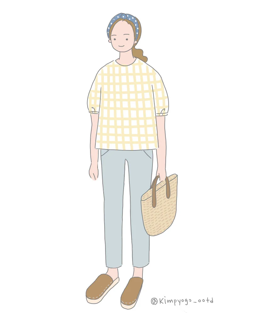 마지막 착장은 사랑스러움을 강조해 보았습니다. 퍼프소매의 상의는 팔뚝살을 가장 완벽하게 가려주고 또 귀여운 매력도 있는데요, 고르실 때 고무줄 부분이 너무 타이트하게 맞는 것으로 하면 더 통통해 보일 수 있으니 주의하세요. 전체적으로 사랑스러우면서도 편안해 보이는 스타일이 된 것은 색상 선택 때문이기도 한데요. 노랑 + 브라운 + 블루 이렇게 잘 어울리는 색상의 개수를 한정적으로 사용하여, 눈이 편안한 느낌을 주었기 때문입니다. 세련된 느낌의 스타일링을 원하시면 잘 어울리는 색의 조합을 3가지 정도의 컬러로 한정하여 시도해보세요. 편하지만 멋진 느낌으로 완성하실 수 있을 거예요.