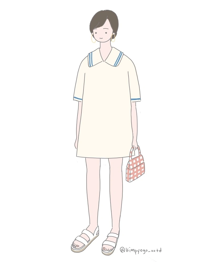 첫 번째 착장은 미니 원피스를 이용한 스타일링입니다. 상체를 조금 넉넉하게 맞는 느낌으로 입어도 예쁜 다리를 드러내면 시선은 다리 쪽을 향하기 때문에 날씬하고 예쁘다고 느껴지게 하는 방법인데요, 귀걸이와 가방 등에서 색으로 포인트를 주면 시선 분산 효과가 있어서 상체의 통통함에 눈이 가지 않도록 할 수 있어요.