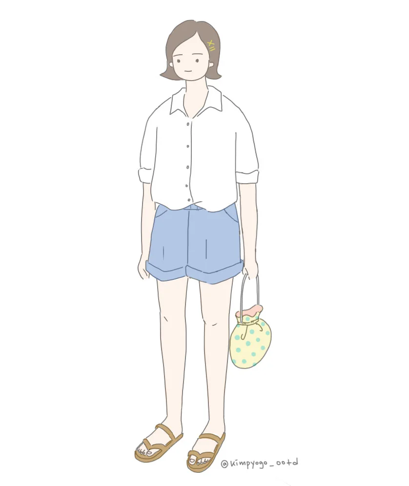 이번에는 하체는 날씬하고 상체는 통통한 체형에게 가장 추천하고 싶은 착장입니다. 약간 넉넉한 사이즈의 소매를 롤업한 리넨 셔츠는 자연스러운 아름다움을 표현할 수 있는 아이템이죠. 여름이지만 어딜 가든 에어컨이 있어서 추위를 느끼기도 하니 긴소매 셔츠를 접어 입는 것도 나쁘지 않은 선택인 거 같아요. 그리고 짧은 반바지를 함께 입었는데요. 반바지는 역시 조금 강조가 되는 색상으로 선택하는 것이 좋고요, 가방은 손으로 드는 가방이면서 패턴이 예쁜 것으로 하면 하체 쪽으로 시선이 쏠려 날씬한 느낌을 더 줄 수 있습니다.