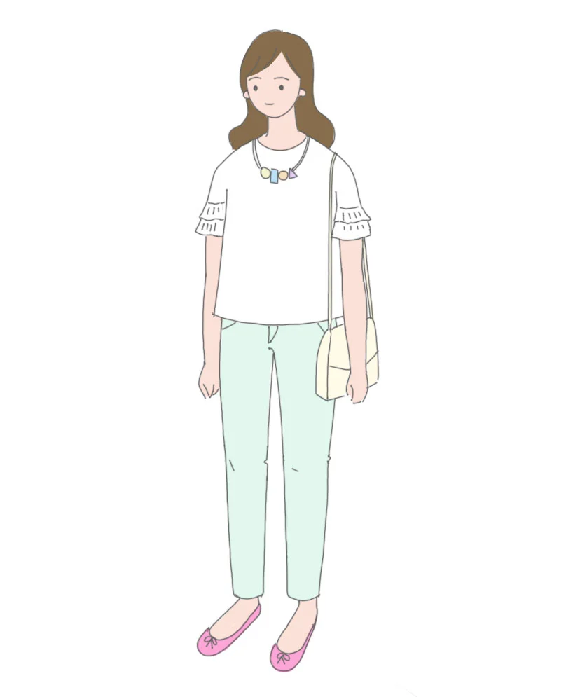 두 번째 스타일링은 컬러를 적극적으로 이용한 착장입니다. 벨 슬리브(종 모양의 소매) 티셔츠나 블라우스는 팔뚝살이 고민이신 분들께 추천하고 싶은 옷입니다. 이 옷을 고르실 때는 어깨 선이 딱 맞거나 어깨보다 작은 것보다는 살짝 오버되도록 입으시는 게 더 날씬해 보일 수 있으니 고르실 때 주의해 주세요. 상체가 통통한 경우 상체는 무조건 어두운 계열로 입어야 한다는 고정관념이 있죠. 그런데 다른 부분에 튀는 색상을 넣어 시선을 색상이 강렬한 쪽을 분산시키면 밝은 색의 상의를 입지 않아도 충분히 멋을 낼 수 있습니다.