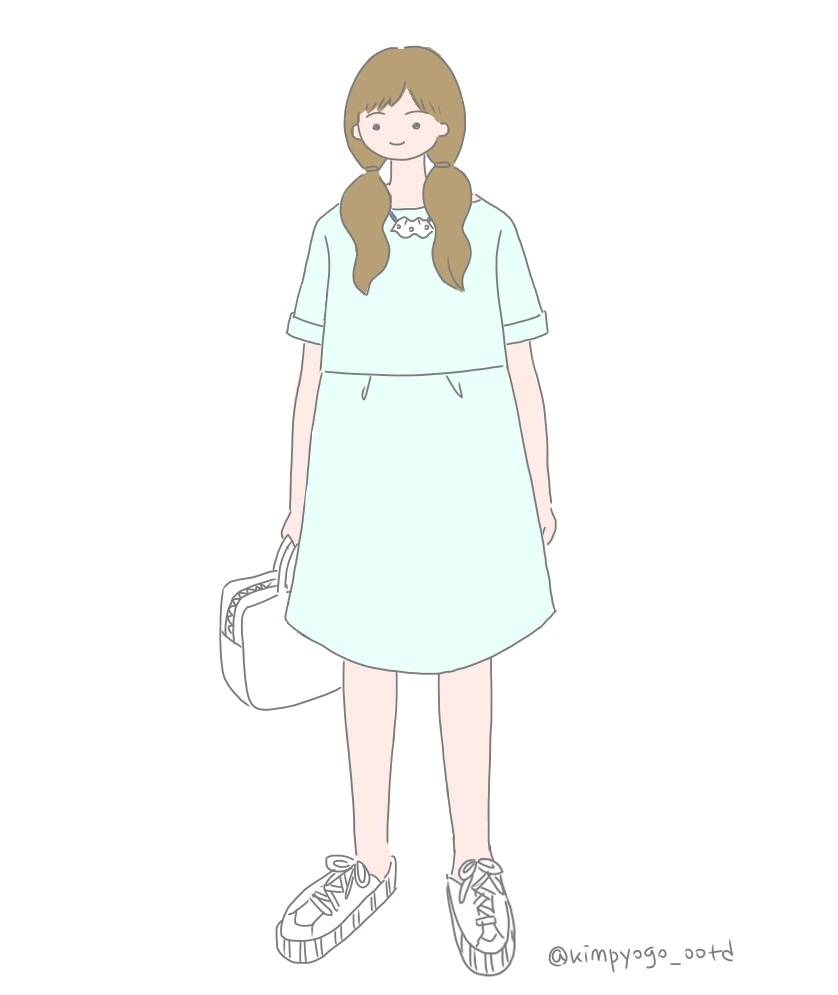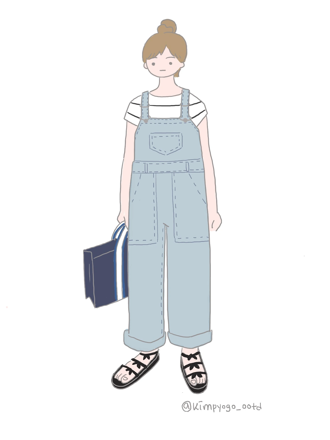 세 번째 착장은 제가 정말 좋아하는 스타일입니다. 어떻게 연출하느냐에 따라서 오버롤은 굉장히 폭넓은 연령대가 소화할 수 있는 옷이라고 생각하는데요, 저는 귀여운 느낌을 살리지만 심플하게 스타일링하여 깔끔하게 마무리하는 것을 선택해 보았습니다. 한 가지 팁을 드리면, 오버롤 자체가 꽤 튀는 아이템이기 때문에 다른 아이템은(상의, 신발, 가방 등) 그림처럼 색상과 디자인의 통일감을 주는 것이 요란해 보이지 않을 수 있습니다. 다양한 오버롤 스타일링은 지난 글 ‘오버롤은 어떻게 입나요?’를 참조해 주셔요.