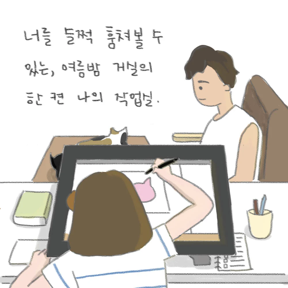 저는 집에서 작업을 하는데 작업방이 아니라 거실 한편에 책상을 두고 합니다. 워낙 잘 잊어버리는 저는 낮에는 작업하다가 처리해야 할 일을 바로 하기에 거실이 편하기도 해서 좋지만, 가장 좋은 것은 저녁시간에 함께 모여있을 수 있기 때문이에요. 못다 한 작업을 할 때 최곰이나 고양이을 슬쩍슬쩍 훔쳐보면 미소가 스륵 나서 기분 좋아진달까요. 그렇게 우리는 참 좋은 여름밤을 보내고 있습니다.