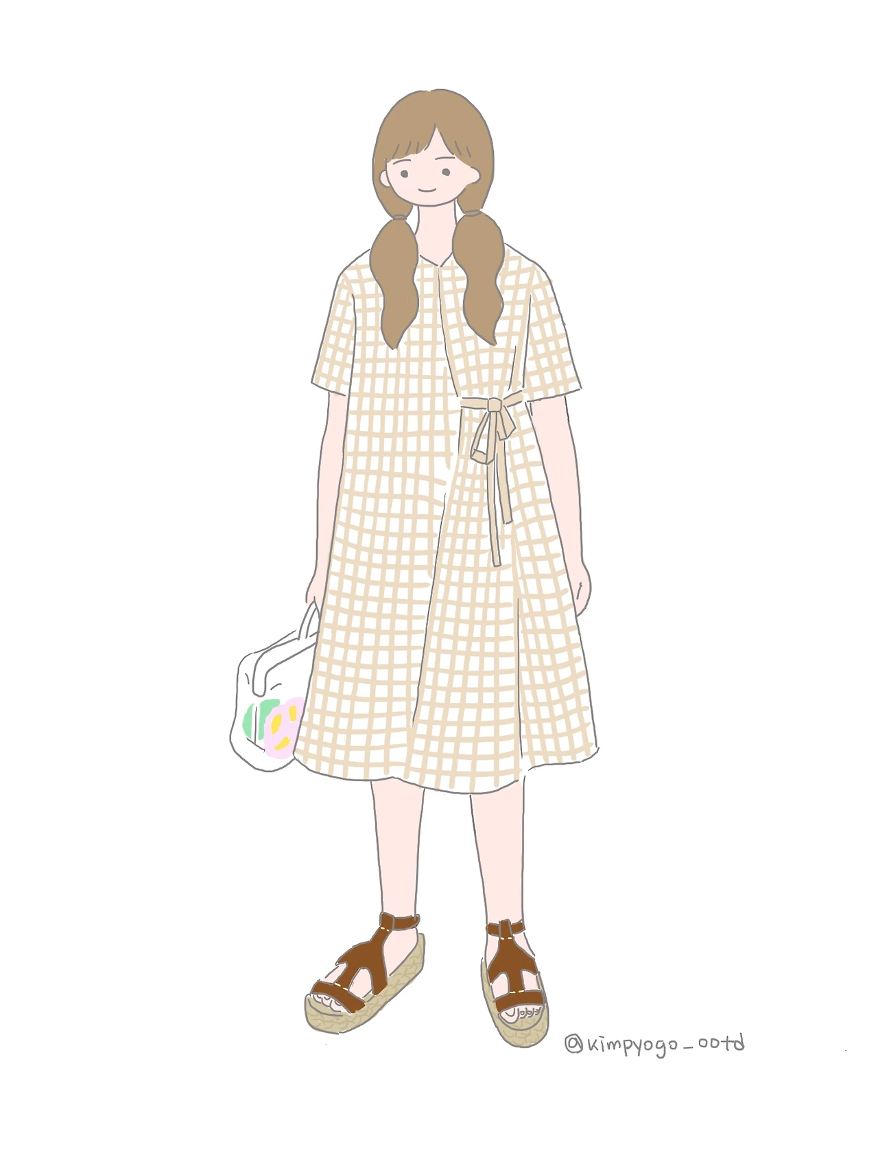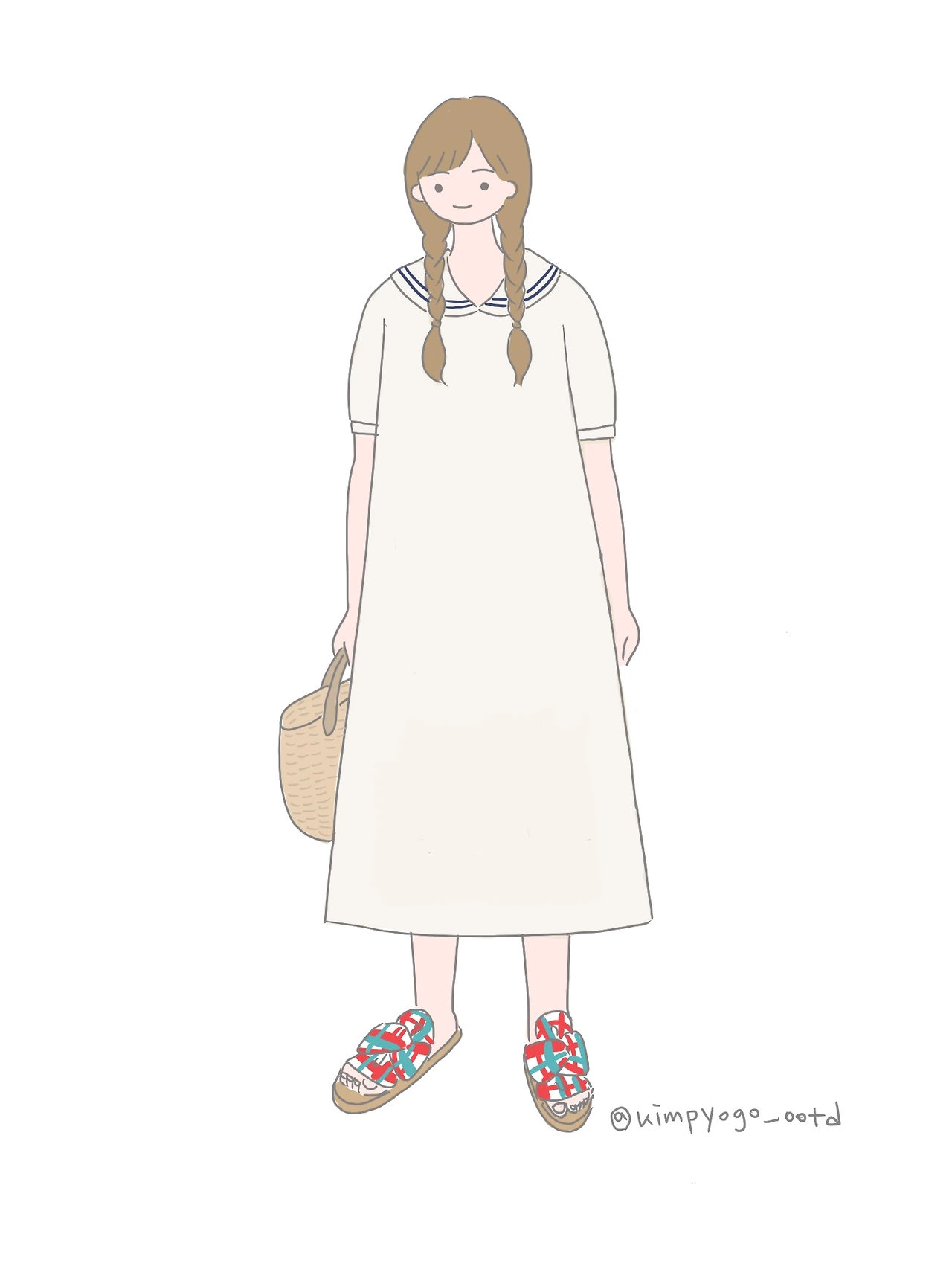 이번에는 정말 심플한 디자인의 원피스에 신발로 포인트를 준 착장입니다. 리넨으로 된 원피스는 대체로 이처럼 심플한 디자인이 많은데요, 그중에서도 저는 세일러 칼라 디자인의 너무 심심하지는 않은 걸로 선택했어요. 이런 밝은 베이지색의 리넨 원피스에 가장 어울리는 것은 라탄이나 스트로 소재의 가방이라고 생각해요. 가방 고유의 자연적인 느낌이 원피스 소재와 같은 결을 같고 있다고 느껴지거든요. 그리고 이번 착장의 포인트는 신발! 바닥은 에스파드류 소재로 된 것에 위에 조금 과감한 패턴이 들어간 것으로 골라서 전체적으로 심심할 수 있는 스타일에 반전을 주었습니다. 만약 화려한 신발이 없으시다면 심플한 신발에 포인트가 되는 양말을 매치하는 것도 추천드립니다.