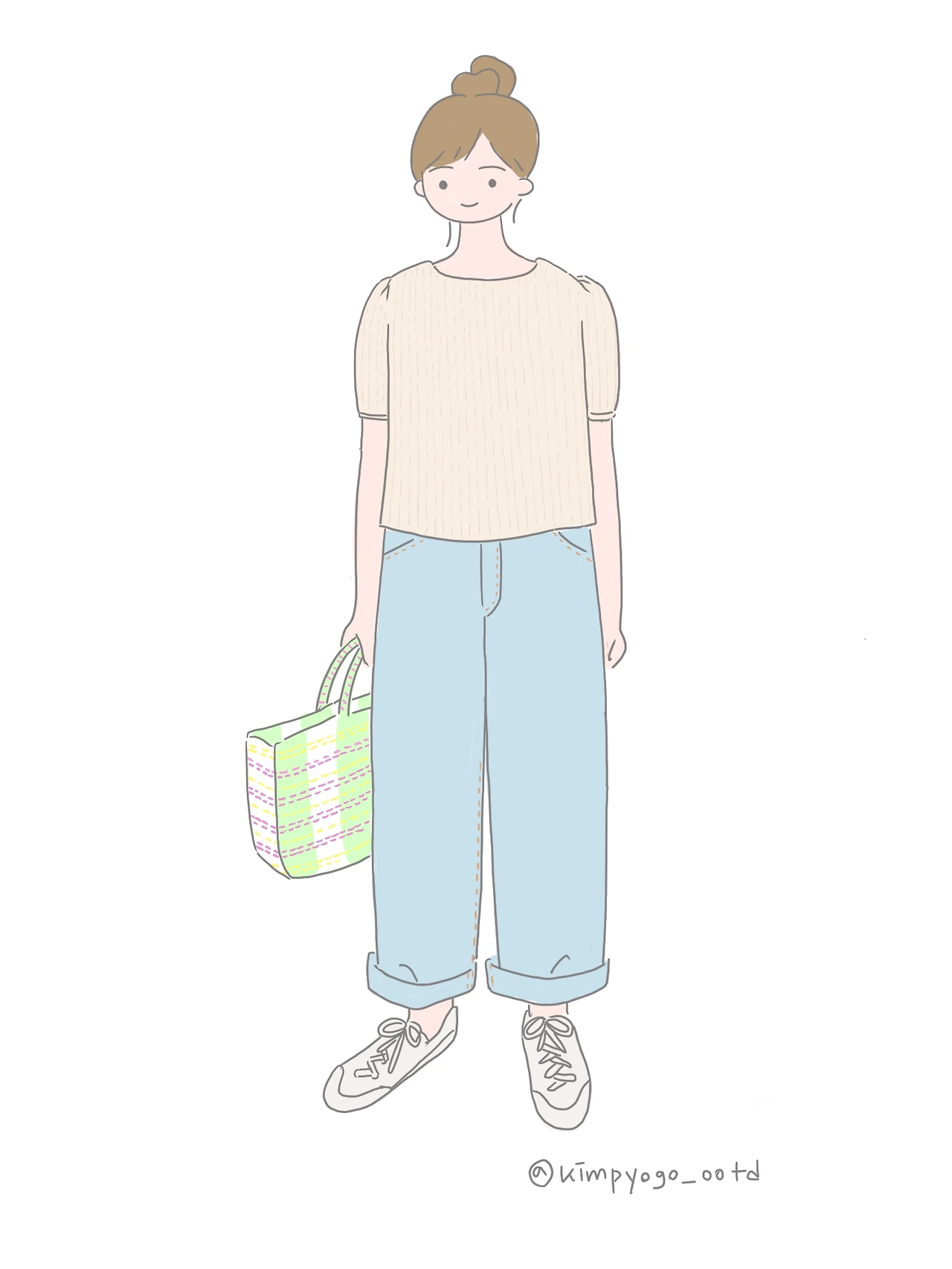 마지막은 가장 캐주얼한 스타일의 착장입니다. 저는 위의 그림처럼 보이프렌드 핏의 청바지를 스키니보다 선호하는데요. 하체 부종이 심한 저는 저녁이면 바지 사이즈가 달라진다고 느낄 정도이기 때문에 약간 헐렁한 바지를 선택하는 것이 좋더라고요. 그리고 원래 체형보다 아주 약간만 헐렁한 걸 입으면 날씬해 보이는 효과도 있지요. 청바지에는 뭘 매치해도 대부분 어울리긴 하지만 저는 이번에 블라우스 스타일의 티셔츠를 골라봤습니다. 블라우스 스타일 티셔츠는 면으로 되어있는 경우가 많아서 빨래가 쉬운 장점도 있고요, 소매가 위처럼 봉긋한 디자인으로 고르시면 사랑스러운 캐주얼 룩으로 완성시켜주기도 합니다. 그리고 위의 그림에서 가방을 화이트 에코백을 매치했다면 보이시한 캐주얼한 느낌을 더 했을 거 같은데요, 저는 색감이 예쁜 여름 향기 뿜뿜하는 짜임 소재의 가방을 골라서 경쾌한 느낌으로 마무리했습니다. 이 스타일은 가방과 신발을 어떤 것으로 선택하는지에 따라서 무척 다양하게 변신할 수 있는 기본적인 착장이라 할 수 있을 거 같아요.