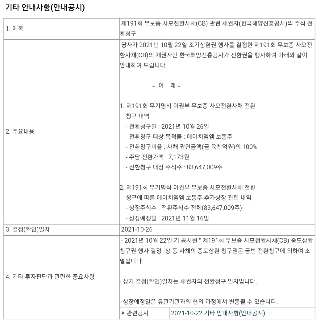 해양진흥공사(해진공)가 보유한 HMM의 영구채의 주식전환이 이슈니까요?얼마 전 산은이 전환사채를 한차례 주식으로 전환해 매물 부담이 큰 상황에 해진공도 한다니 주가가 더 빠질까 걱정인 거죠.