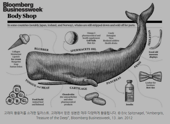 고래의 몸에서 가죽을 비롯한 갖가지 값나가는 부위를 떼어내는 일이 끝나자, 드디어 머리의 밑동을 자르는 일이 시작됐다. 고래의 정수리 위로 밧줄을 타고 내려가 분수공 주위의 부드러운 기름층에 구멍을 하나 뚫었다. 그는 로프의 길이에 맞춰 그 구멍 아래로 양동이를 넣었다. 그리고 잠시 이곳저곳 살피다가 릴에 감기 시작했다. 그러자 얼마 지나지 않아 양동이가 밖으로 불쑥 튀어나왔다. 하얀 액체가 거품을 일으키며 철철 넘쳐흘렀다. 동료들은 그 귀중한 액체를 통 속에 쏟아부었다. 이 작업은 일렬로 놓인 통들이 모두 꽉 찰 때까지 백번 가까이 반복됐다. 이 액체가 바로 모든 고래기름 중에 가장 순도가 높다는 경뇌유였다... 향유고래의 머리에는 보통 수백 배럴의 경뇌유가 들어있다.