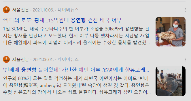 용현향이 지금도 이렇게 비싸게 팔리는 이유는 구하기 힘든 데다 값비싼 향수의 재료로 활용되기 때문입니다. 용현향 자체적으로도 향이 나지만 용현향을 활용하면 향수의 지속성을 크게 높일 수 있어 조향사들에게 인기가 높다고 하죠. 고급 향수인 샤넬 No5. 에 용현향이 쓰였다고 알려집니다. 용현향은 수컷 향유고래에게서 만들어지는데, 이들이 심해에서 주식으로 먹는 대왕고래의 딱딱한 이빨 등이 소화되지 않고 소화액 등과 뭉쳐 있다 입이나 배설물로 배출된 것인데요. 오랜 기간 바다를 떠돌며 딱딱하고 회색빛으로 변해 발견되는 겁니다 특히 막 배설돼 나온 것보다 오랜 시간 일종의 숙성의 과정을 거칠수록 값어치가 올라간다고 하는데요. 지금은 고래잡이도 금지돼 있으니 예전보다 더 귀하게 된 상황입니다. 심지어 미국과 호주 등에선 고래 사냥은 물론 용현향의 거래 자체도 금지하고 있거든요. 멸종위기인 향유고래를 보호하기 위해서죠.