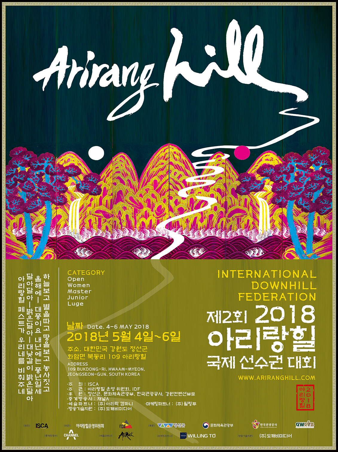 아리랑힐 국제 선수권 대회는 강원도 정선군 화암면 북동리 109 아리랑힐에서 펼쳐지며, 오픈, 우먼, 주니어, 마스터, 루지 등 다섯 가지 카테고리로 세분화되어 진행될 예정이다.