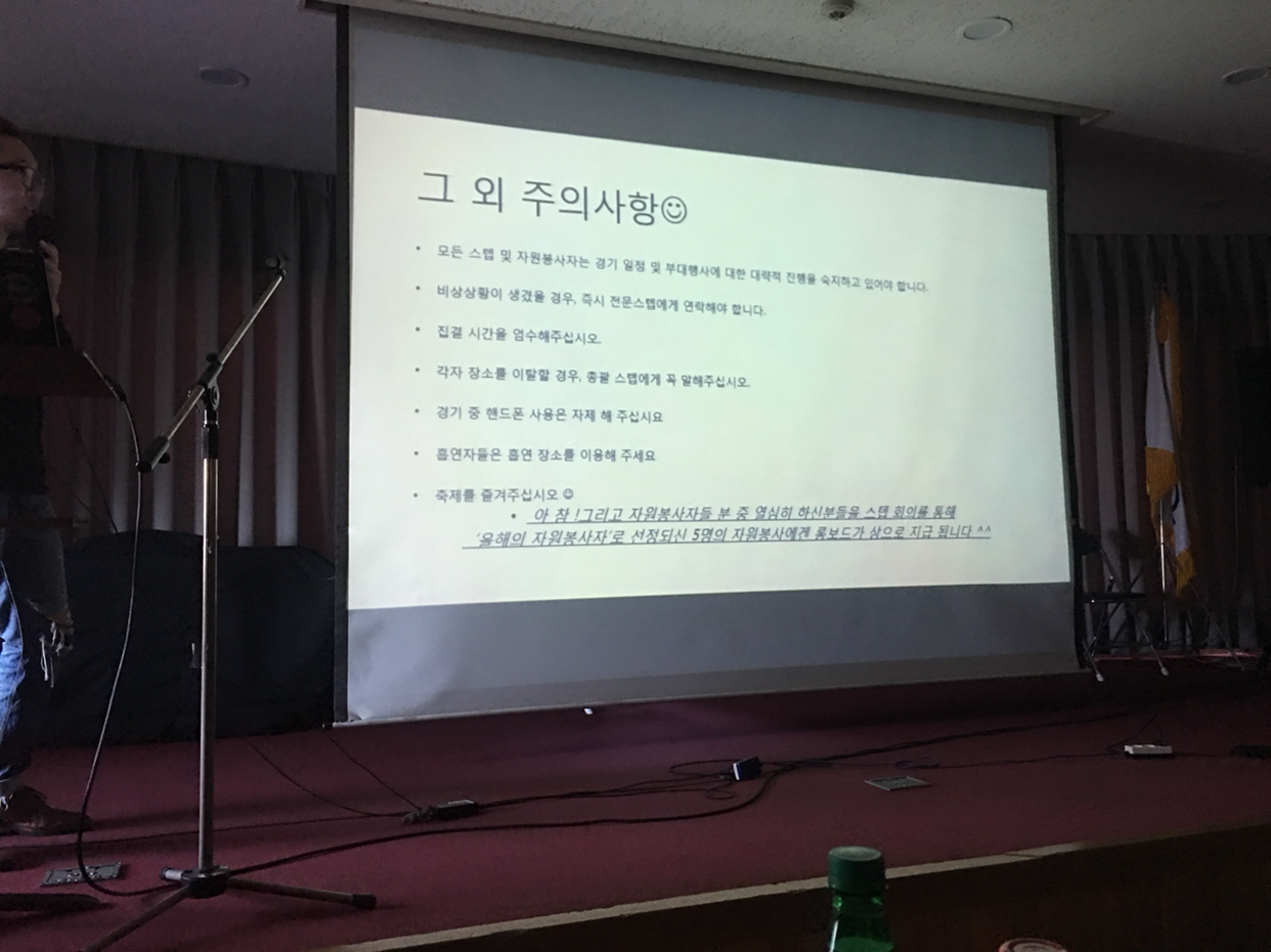 이번 행사를 함께 할 스탭 분들과 오리엔테이션에 참가한 서포터즈 분들. 다들 인상도 좋고 스케이트보드에 대한 열정이 있는 사람, 단순히 자원봉사를 하며 외국인들과 즐거운 행사를 만들기 위해 온 사람 등 다양했다. 무엇보다도 한국을 세계에 알릴 수 있는 중요한 기회로서 이 행사가 진행될 수 있도록 더 많은 사람들이 모인다면 좋을 것 같다.
