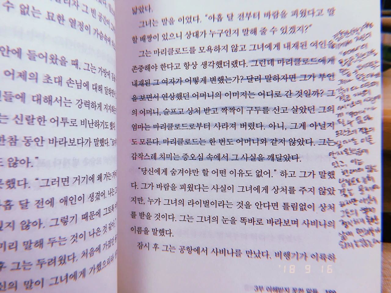P.506 이 슬픔은 우리가 종착역에 있다는 것을 의미했다. 이 행복은 우리가 함께 있다는 것을 의미했다. 슬픔은 형식이었고, 행복이 내용이었다. 행복은 슬픔의 공간을 채웠다.