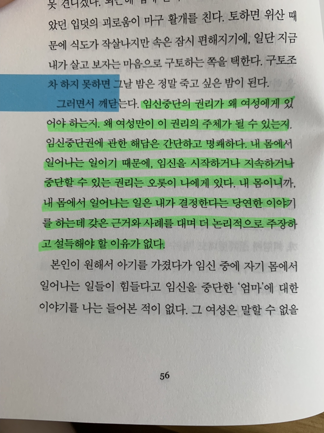 그래, 우리 사회는 아직 갈 길이 멀구나. 지금 내가 아이를 낳아 키울 이 시대에는 요원한 일이겠구나, 하는 절망감이 다시 온몸을 휘감았다. 내 다음 세대는 좀 더 나은 삶을 살아야 한다는 말에 적극 저자의 말에 적극 동의한다. 하지만 내가 이 세상을 바꿀 수 있을지는 자신이 없어서 나는 탈조선(한국을 벗어난 곳에서 새로운 삶을 꾸리는 것)을 다시금 꿈꾼다. 도망치는 거, 맞다. 나는 도저히 자신이 없으니까.