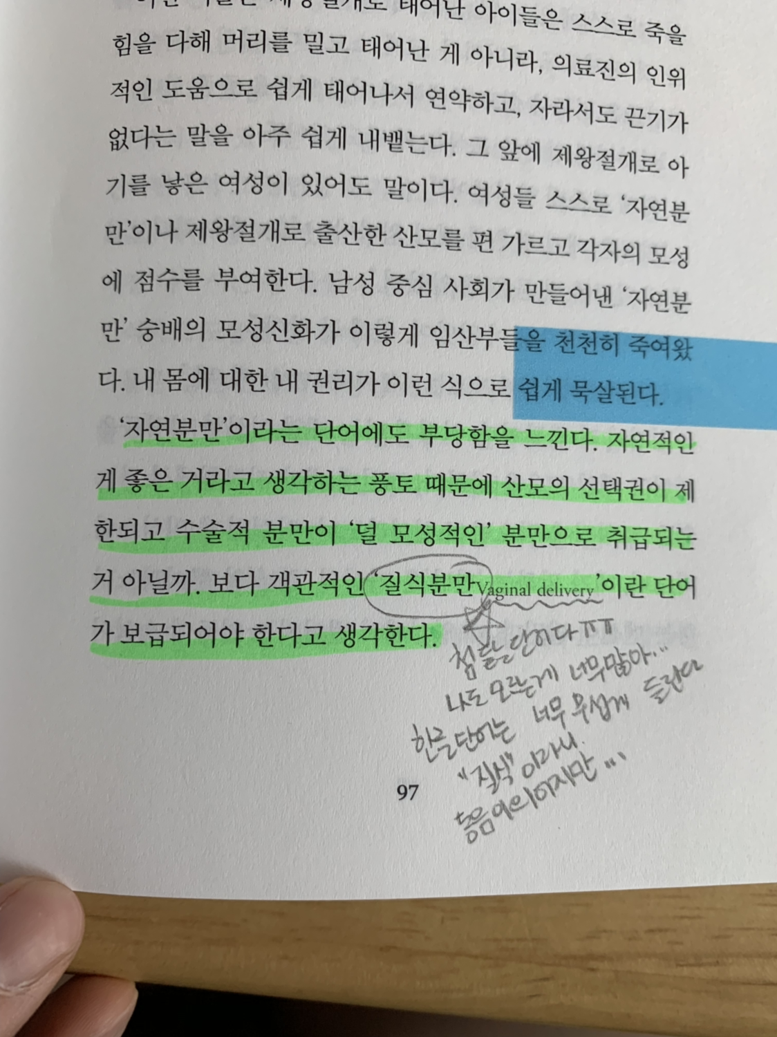 이 책을 통해 새로 알게 된 단어도 있었다. '질식분만 Vaginal delivery'이라는 단어인데, 흔히 말하는 '자연분만'을 뜻했다. 네이버에 '질식분만'을 검색하면 그 단어에 대한 자세한 설명이 나오지 않고, 자연 분만에 대한 설명만 구구절절 나와있다. 아직도 단어에 대한 인식은 가야 할 길이 멀다.