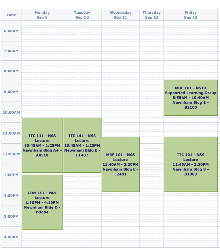 1학기는 총 6개 과목을 수강한다. 아래 시간표에 있는 다섯 과목과, 온라인으로 언제든 수강이 가능한 한 과목이다. 온라인 수강 과목은 세네카 컬리지에 관한, 그리고 전반적인 컬리지 생활에 관한 교양 수업이었고 대학도 졸업하고 사회생활도 하고 온 나와 같은 사람들에겐 사실상 큰 의미가 없는 과목일지 몰라도 갓 고등학교 졸업하고 사회에 첫 발을 내딛는, 대학 생활이 처음인 사람들에겐 유익하고 알찬 커리큘럼으로 짜여 있다.