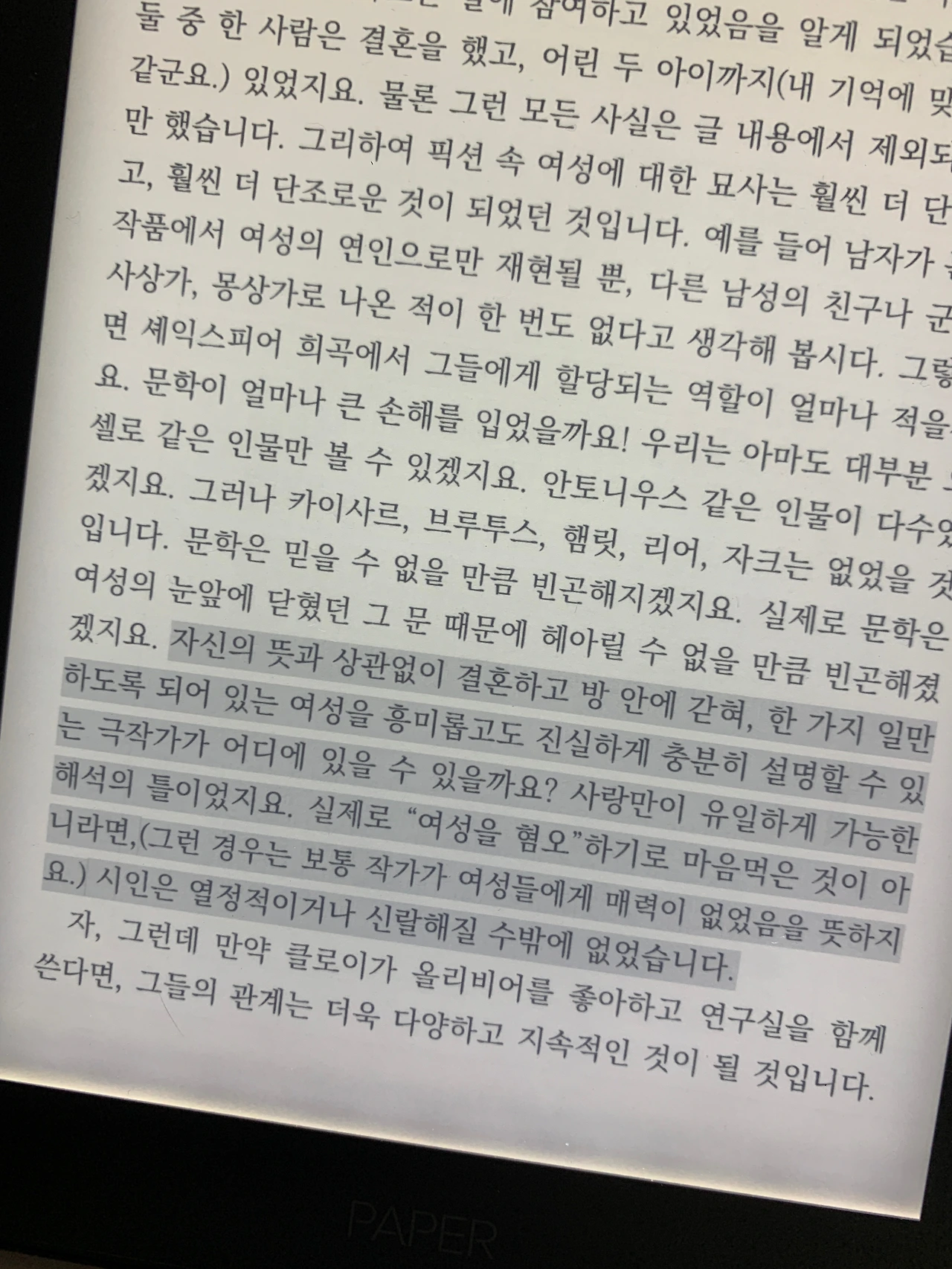 100년 전에 쓰인 글이고, 버지니아 울프가 살았을 때에 비하면 이젠 글을 쓰는 여성이 차고 넘친다고 해도 과언이 아닐 것이다. 경험의 폭이 여성이라고 한정되지 않으며, 원한다면 남성과 같은 권리를 누릴 수도 있게 되었다.