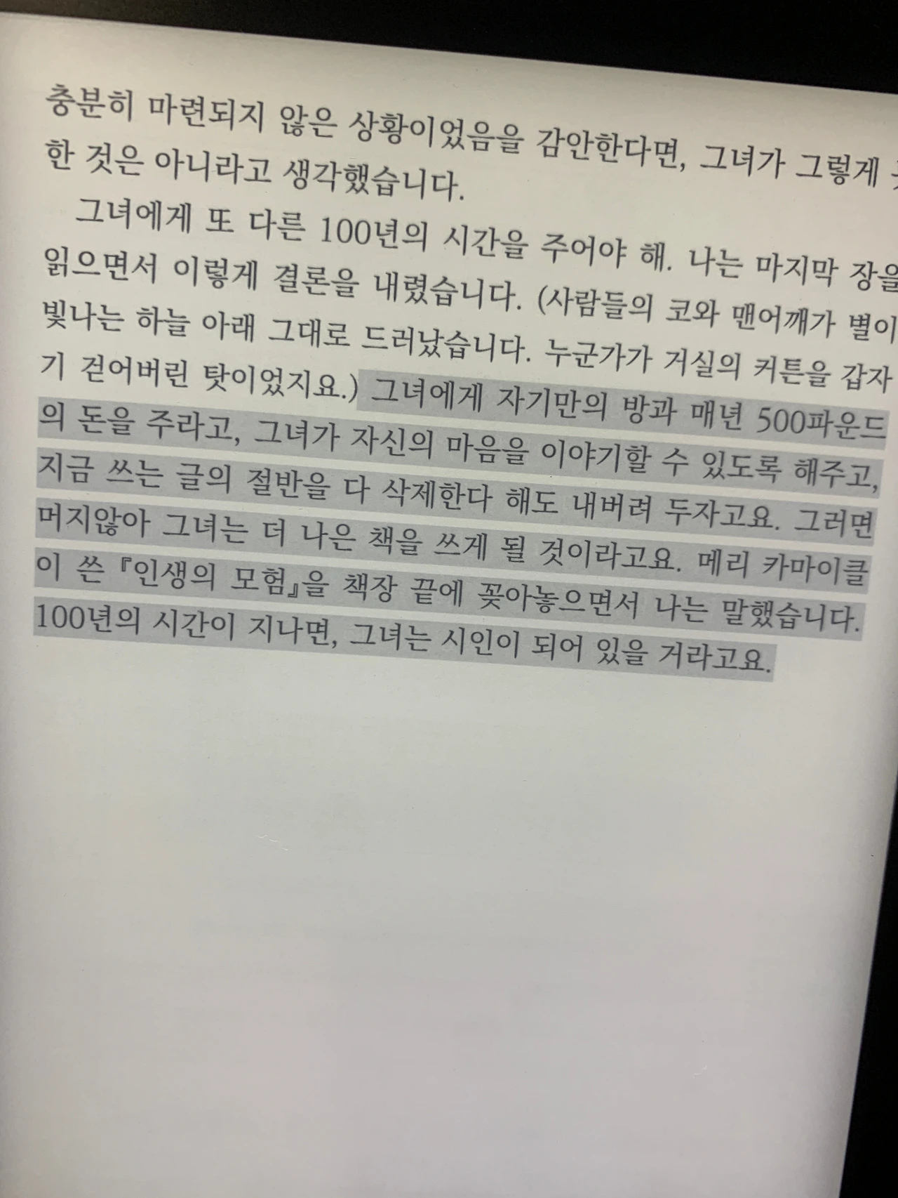 분명 한 세기 전에 살았더라면 누릴 수 없었을 걸 많이 누리고 살았다. 대학 교육까지 마쳤고, 지금은 해외에 나와 살고 있다. 직업을 가졌으며, 내 이름으로 된 통장에는 지금 당장 일을 하지 않아도 한동안 먹고 살 걱정이 없는 돈이 모여 있다. 꾸준히 글을 쓰려고 노력하며 틈틈이 책을 읽는다. 그렇다면 나는 내 방과 500파운드를 가진 사람이 되었을까?