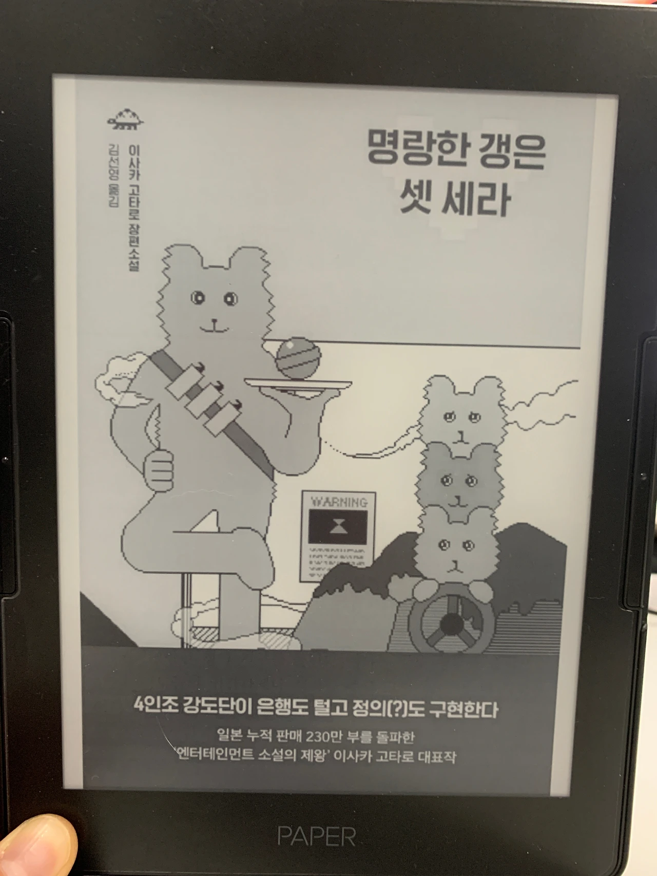 "로망은 어디에"라고 외치던 교노의 목소리가 선명하던 때도 있었다. 이사카 코타로는 내가 고등학생이던 시절부터 즐겨 읽던 작가였는데 꽤 초창기 작품으로 <명랑한 갱> 시리즈를 읽었던 기억이 있다. 말도 안 되는 말을 말처럼 늘어놓는 재주가 있는 교노, 거짓말을 간파하는 능력이 있는 나루세, 소매치기 기술이 기가 막힌 구온과 오차 없이 정확한 생체 시계 덕분에 신호 한 번 안 걸리고 온갖 도로를 질주할 수 있는 유키코. 이 넷이 모여 은행강도짓을 한다. 다치는 사람은 없게, 은행에도 큰 피해가 안 가는 선에서만 돈을 뺏는다. 이상한 윤리관을 가진 이들의 모험이 3회 차를 맞이한 게 <명랑한 갱은 셋 세라>다. 한국엔 번역되어 나온 지 오래되지 않은 모양이지만, 일본에서는 다른 시리즈와 비슷한 시기에 출간된 모양이었다.