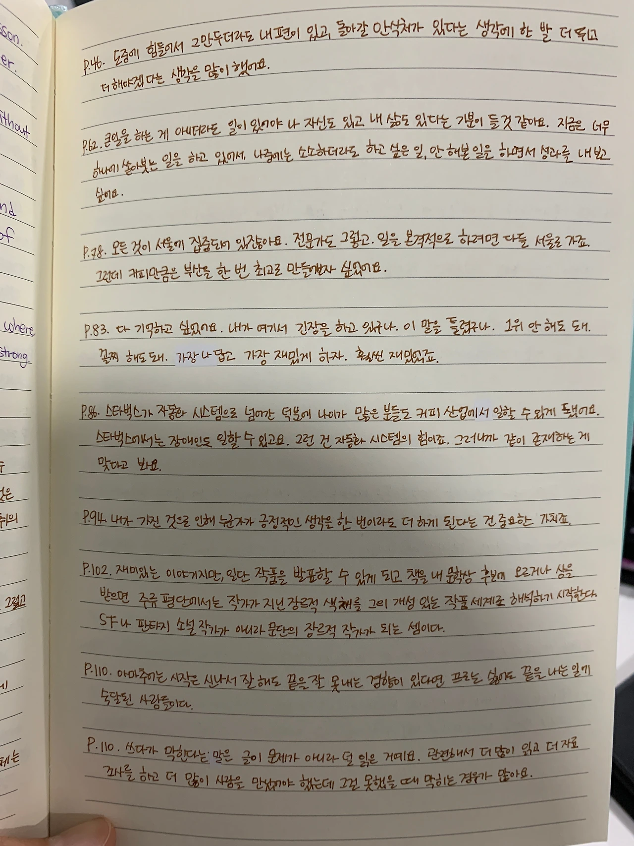 P. 110. 아마추어는 시작은 신나서 잘해도 끝을 잘 못 내는 경향이 있다면, 프로는 싫어도 끝을 내는 일에 숙달된 사람들이다. -정세랑