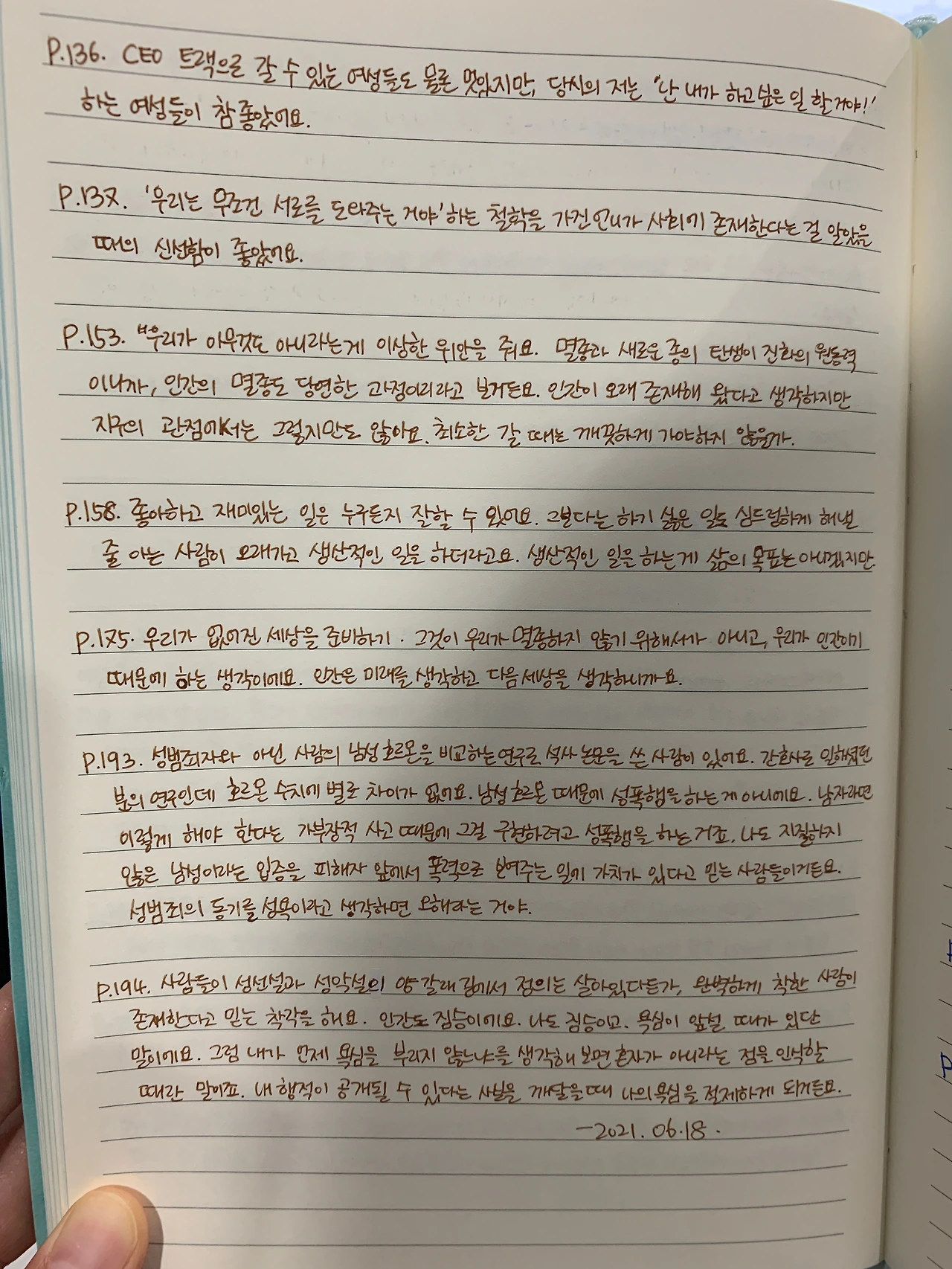 P. 158. 좋아하고 재미있는 일은 누구든지 잘할 수 있어요. 그보다는 하기 싫은 일도 심드렁하게 해낼 줄 아는 사람이 오래가고 생산적인 일을 하더라고요. 생산적인 일을 하는 게 삶의 목표는 아니겠지만. - 이상희