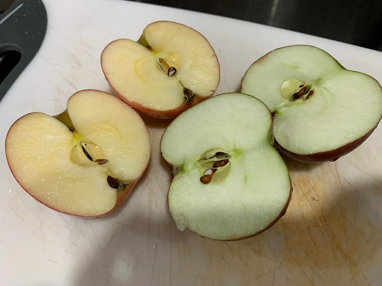 어쩐지 두 사과의 맛을 비교하며 먹어보고 싶어 로얄 갈라 사과와 매킨토시 사과 둘 다 함께 썰었다. 푸르스름하게 하얀 쪽이 매킨토시 사과였는데, 웬걸, 그때의 달콤함은 간데없고 시큼새큼하고 아삭한 식감만 남아있었다.