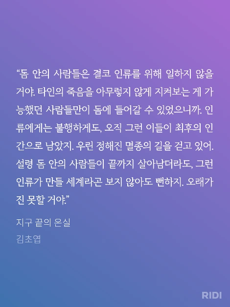 제니퍼 로렌스와 레오나르도 디카프리오가 주연을 맡은 넷플릭스 영화, <돈 룩 업 Don't Look Up>의 한 장면이 떠올랐다. 혜성이 지구로 곤두박질 치는데, 저들 살겠다고 우주선을 타고 지구 밖으로 도망치는 몇몇 사람들. 그 사람들은 아마 <지구 끝의 온실>의 세계에서 분명하게 돔 안의 가장 좋은 자리를 차지하고 앉아있을 사람들일 것이다. 타인을 착취하며, 그 착취가 정당하다며 합리화하고 제 살을 찌우기에만 급급할 것이다.