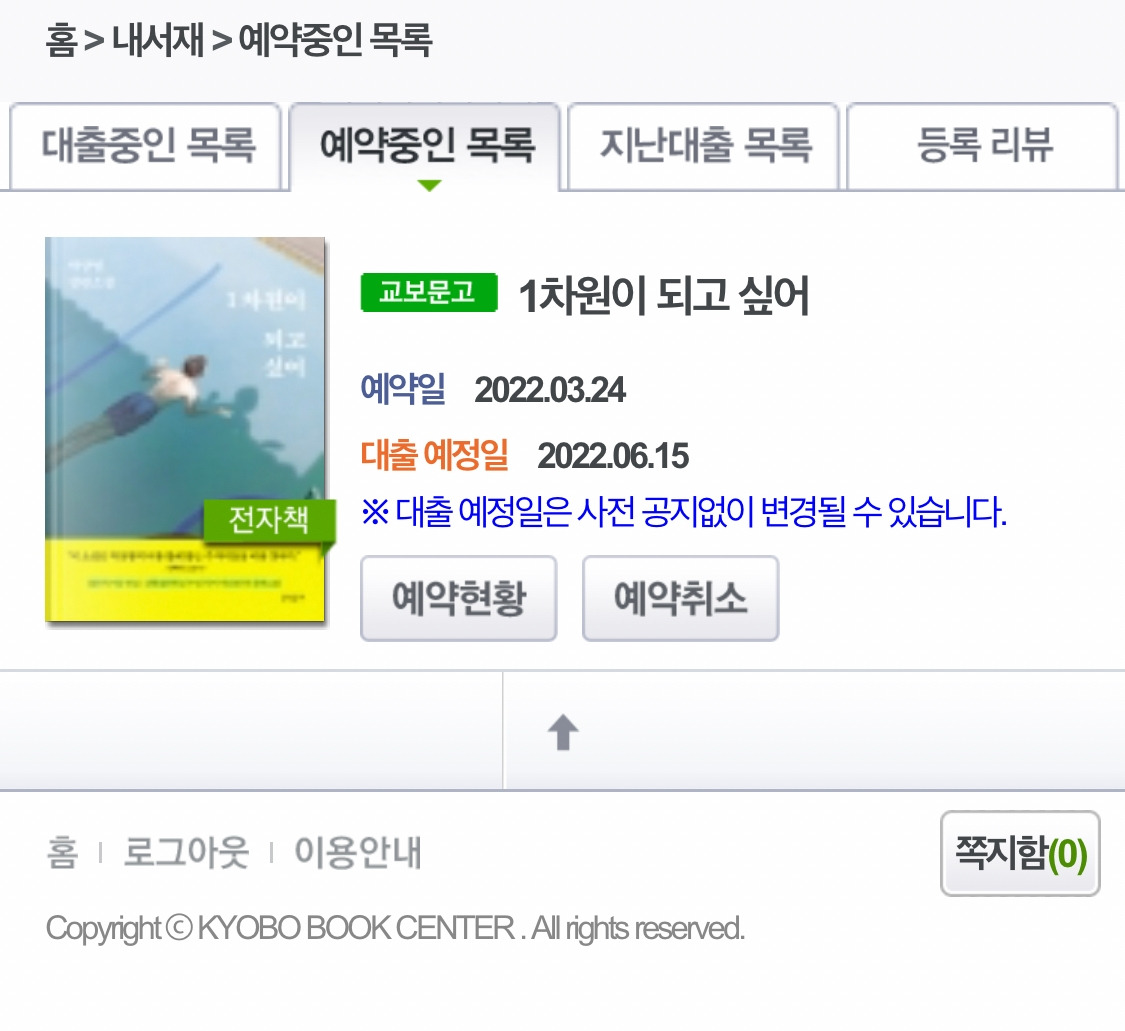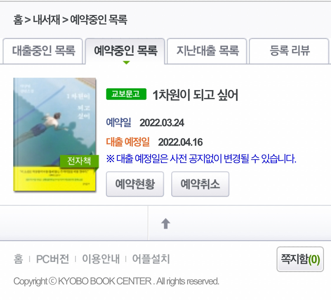 교보문고 앱에 연동된 성남시 전자도서관 처음 이용해 봤는데, 좋은 시스템이지만 대출 예정일이 바뀌면 푸시 알람이라든지 알람을 좀 줬으면 하는 아쉬움이 있었다.