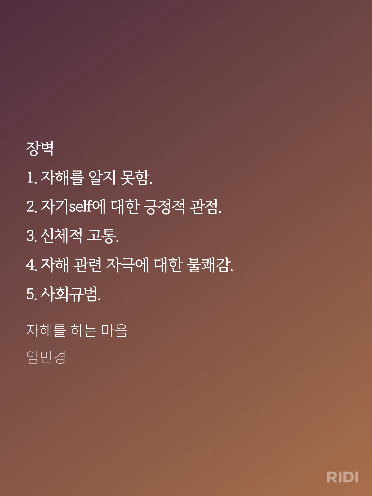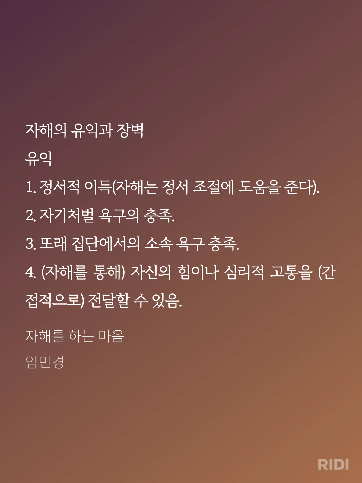 특히나 자해를 하는 데 '유익함'이 있고 자해를 하지 못하도록 막는 '장벽'이 있다는 관점은 나에게도 꽤 흥미로웠다. 자해 자체를 긍정적으로 보면 안 된다는 마음에 과거의 나를 죄인 취급하던 마음을 좀 놓을 수 있게 되었다.