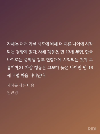 책에서 언급한 '최초 자해 시도 연령'과 '최초 자살 시도 연령'은 내 청소년기를 꿰뚫어 본 것처럼 제시되어 있었다. 내가 기억하는 나의 첫 자해는 중학교 2학년 때, 그러니까 만으로 13세일 때, 방의 불을 모두 끄고 책상 아래에 몸을 구겨서 들어간 상태로 커터칼을 가지고 손목을 그었던 것이다. 종이에 무심코 베인 손가락에 비명을 지르던 나는, 스스로 손목에 상처를 내면서 가느다란 선이 그어지고 그 선이 빨갛게 물드는 것을 보며 어떤 희열을 느꼈다. 아마도, 내가 살아있다는 감각에서 오는 희열이었을 것이다. 첫 자살 시도는 고등학교 2학년 때, 그러니까 만 16세일 때, 역시 집에서, 같은 공간에서, 또 손목을 그었을 때였다.