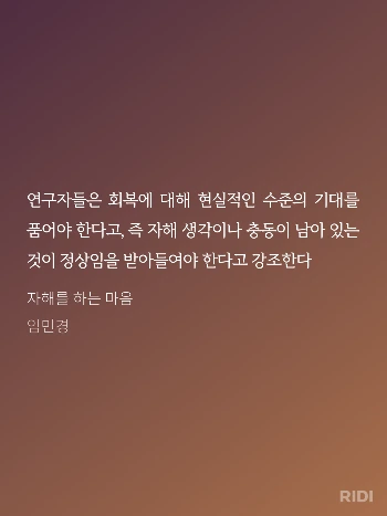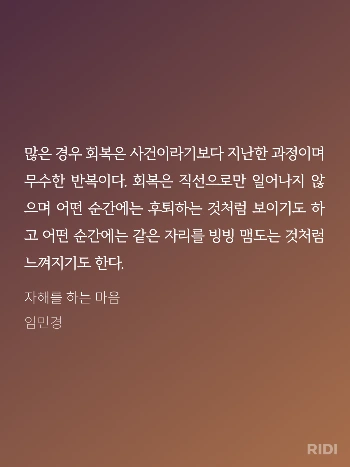 임민경의 <자해를 하는 마음>에는 자해를 하는/했던 사람들의 마음의 근원을 찾아가는 여정과 회복의 이야기가 있었다. 이 책을 읽기 전에는 나도 '회복'이라는 것이 자살 충동이나 자해 충동이 전혀 없어진 상태를 뜻하는 거라고 생각했기 때문에, 불현듯 다시 나타난 자살 충동에, 나는 역시 정신병이 다 낫지 않은 걸까, 하는 괴로움을 느끼지 않을 수 없었다. 그래서인지 책의 이 구절이 참 위로가 되었다.