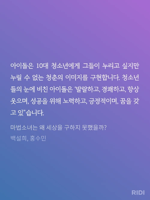 한편, 한국의 아이돌 산업을 돌아보면 아직도 갑갑한 마음이 든다. 특히 여자 아이돌의 데뷔 연령대가 점점 어려진다는 말도 있는데, 사실 아이돌의 데뷔 연령대는 늘 어렸다. 지금은 세계적인 대 스타가 된 보아만 하더라도 초등학생 때 데뷔를 했다던가. 자신의 꿈이기에 노력하고 애쓰는 아이들을 보면 안쓰럽고 기특한 한편, 여전히 착취당한다는 느낌을 도저히 지울 수가 없었다.
