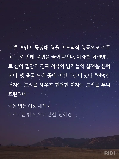 P. 14. 어떤 여성이 용감하게 역사에 끼어들고자 했다면, 그녀는 모략을 일삼고 잔인하며 거짓말을 입에 달고 사는 매우 나쁜 여자로 기록되었다. 전 세계의 역사가들이 비슷한 목적을 위해 그런 짓을 저질렀다. 여자가 역사에 끼어들면 나쁜 일이 생긴다는 사실을 수단과 방법을 가리지 않고 입증하려 한 것이다.